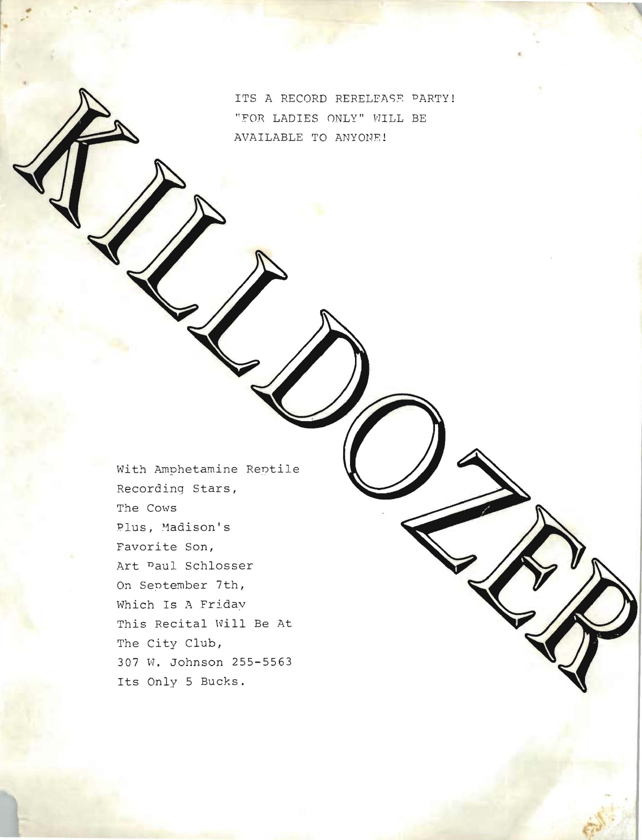 I have no idea what year. It must have been late 89 or early 90’s. Killdozer. Dalton turned me on to them. Slow, dirge filled, anger laced and funny as hell. Sort of like Black Flag through syrup.