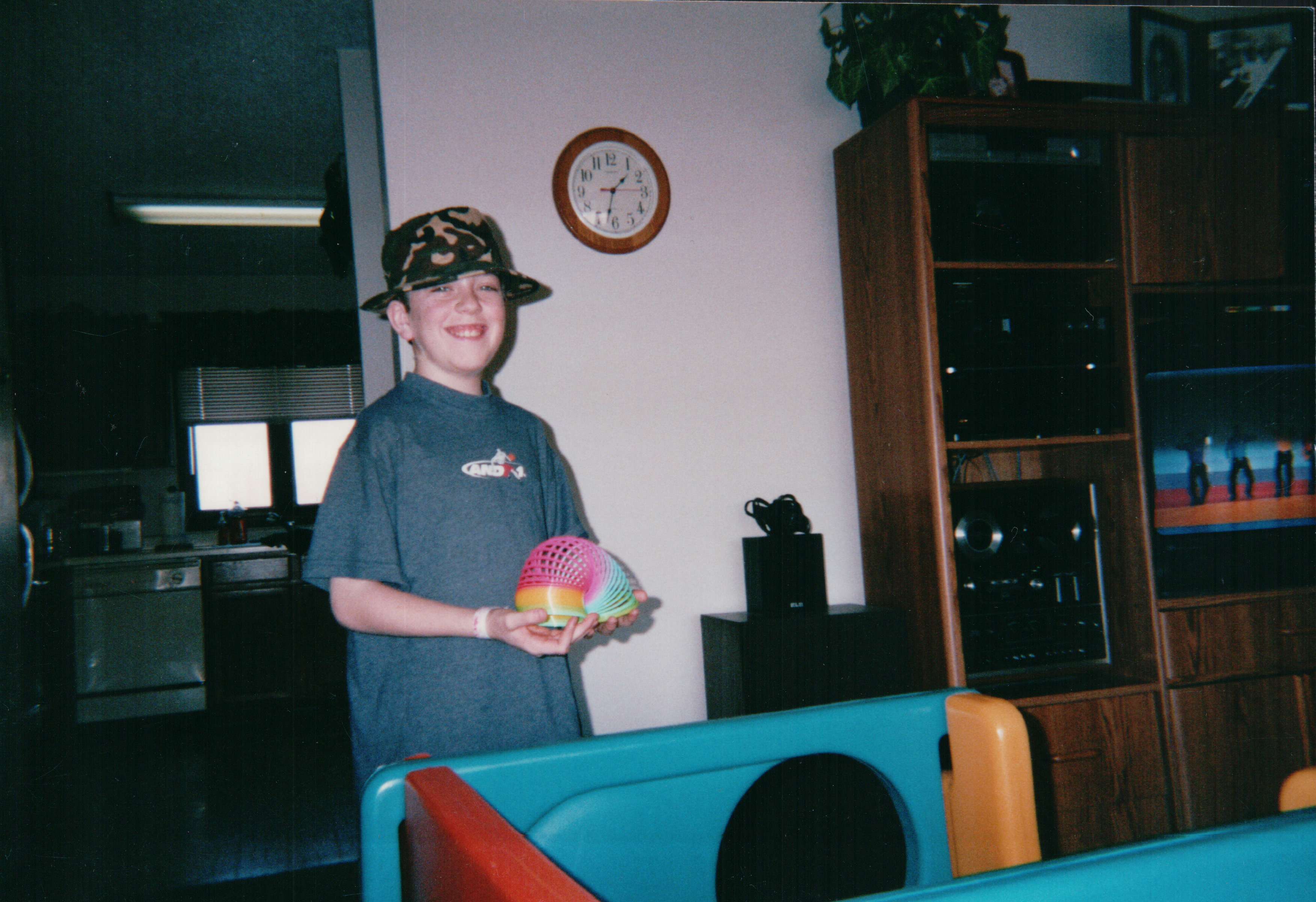 In the basement I still have the Surround Sound speakers that I at one time had connected to the stereo at theCentennial Parkwayduplex. They were good for certain kinds of sounds, but were hard to get adjusted. Some movies that I patched through a VCR to the stereo, bypassing the TV sound, were amazing. Sound seemed to come from behind you and made some creepy movies positively skin crawling. For music however, just give me a good old equalizer. I did try for a while, as this photo from some point in the early 2000’s shows. The tiny square speaker on top of the huge (old faithful) speaker is the surround sound left speaker. The mid speaker was on top of the entertainment center. That’s Max and for some reason the Little Tikes play gym is in the living room. Clearly The Wiggles is on TV. Joey must have been in the room.