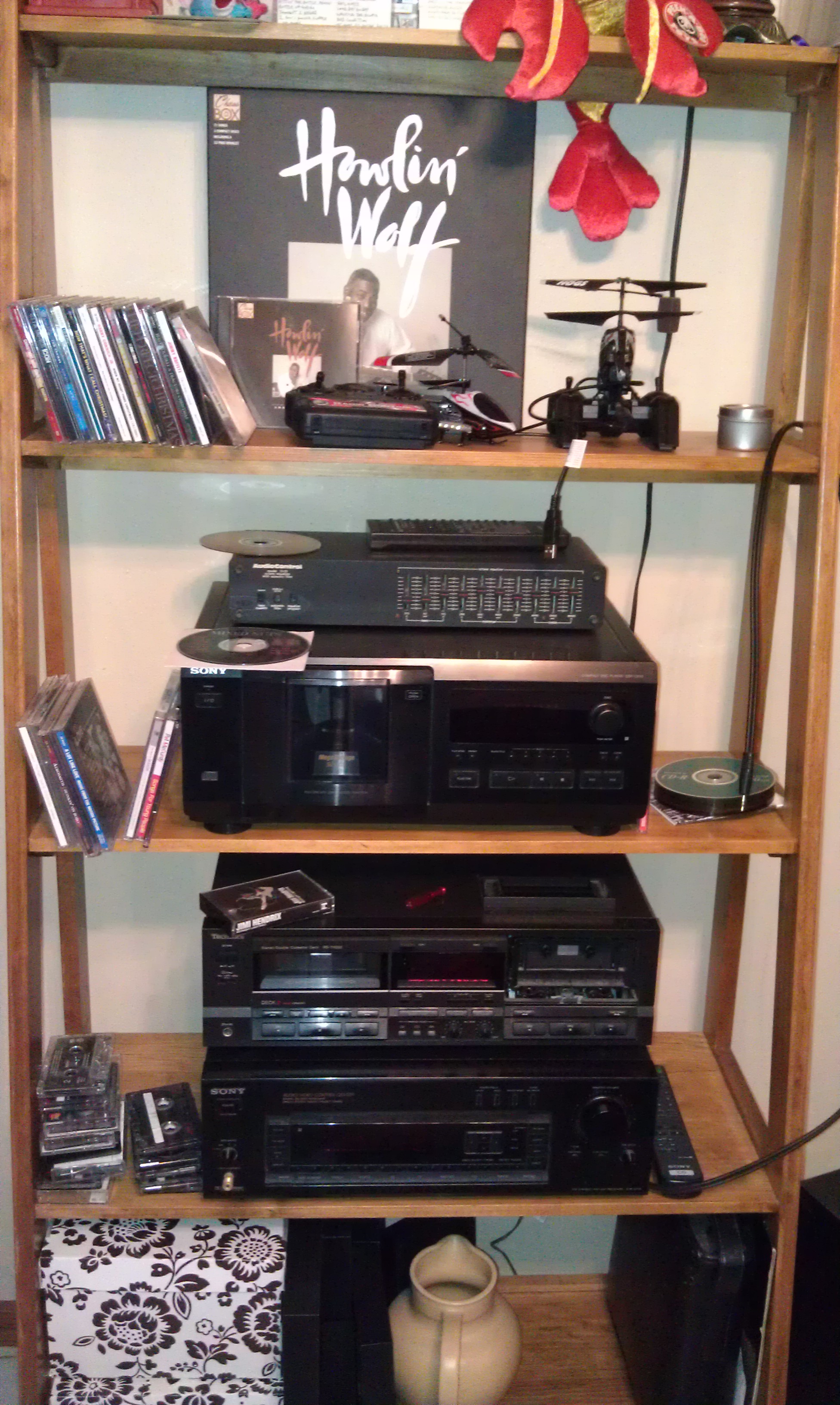 This is the stereo I had in the basement for the first 4 years I lived in this house. I had converted to I-Pod and portable speakers by the time we moved in. About a year ago on a whim, I brought the old rig up and plugged it all in. It has the basics: Equalizer, 50 CD changer, tape deck (broken unfortunately) and on the bottom of the stack my Sony receiver. There is a cord hanging unconnected that I can use to hook up my I-Pod. That is about the only use they get anymore since I now carry around my entire music collection on the external.