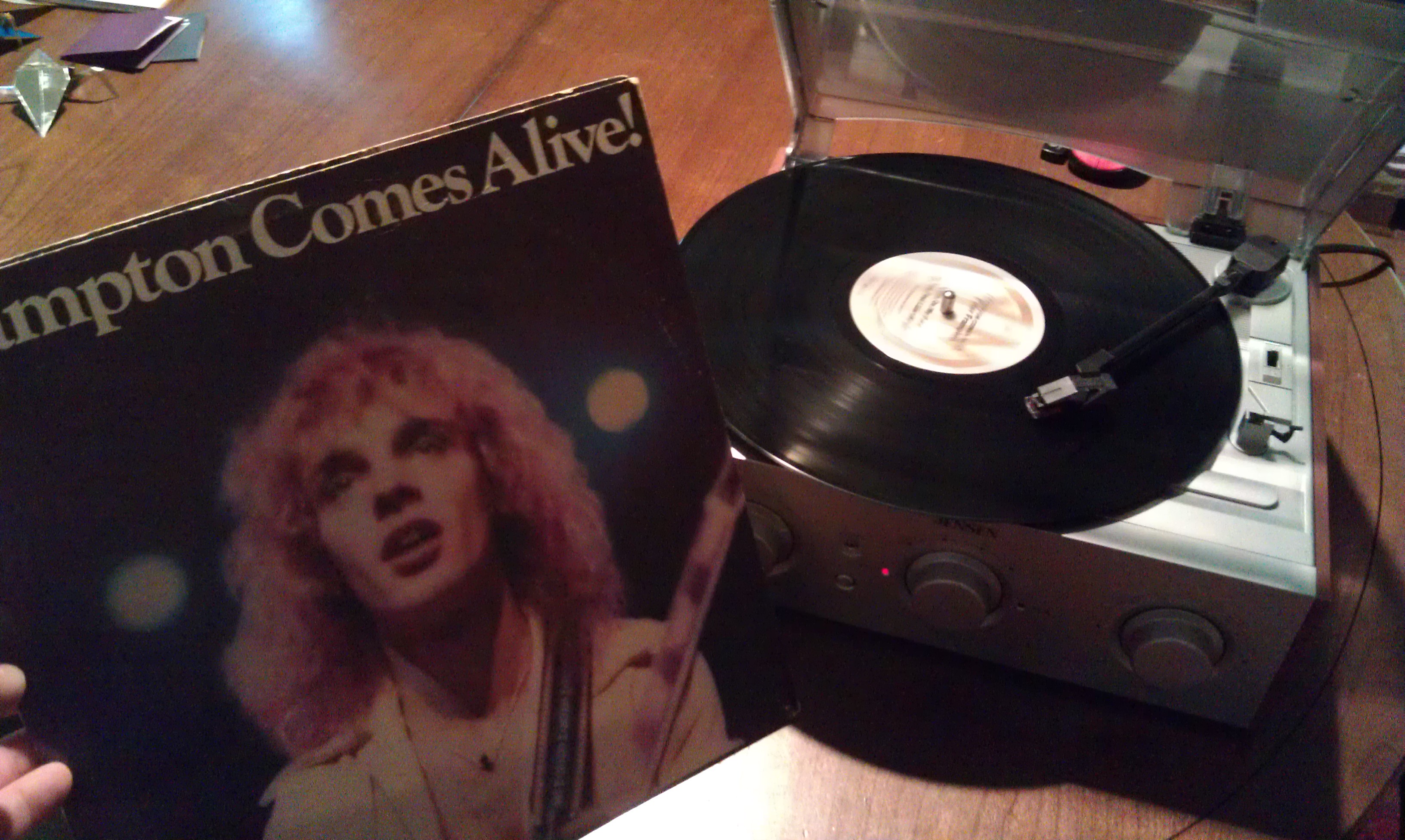 Abbey returned home for a few weeks this past weekend from Georgia. She brought her USB Record Player and records with her at my request. She bought and brought “The Sex Pistols – Never Mind The Bollocks”. That should sound interesting coming out of the little built in speaker. Of course I wanted her to bring it because this gave me a chance to play some of the vinyl I had purchased from the garage sale. The first track I wanted to play?… sorry Linda. I broke out the “Peter Frampton – Frampton Comes Alive”.