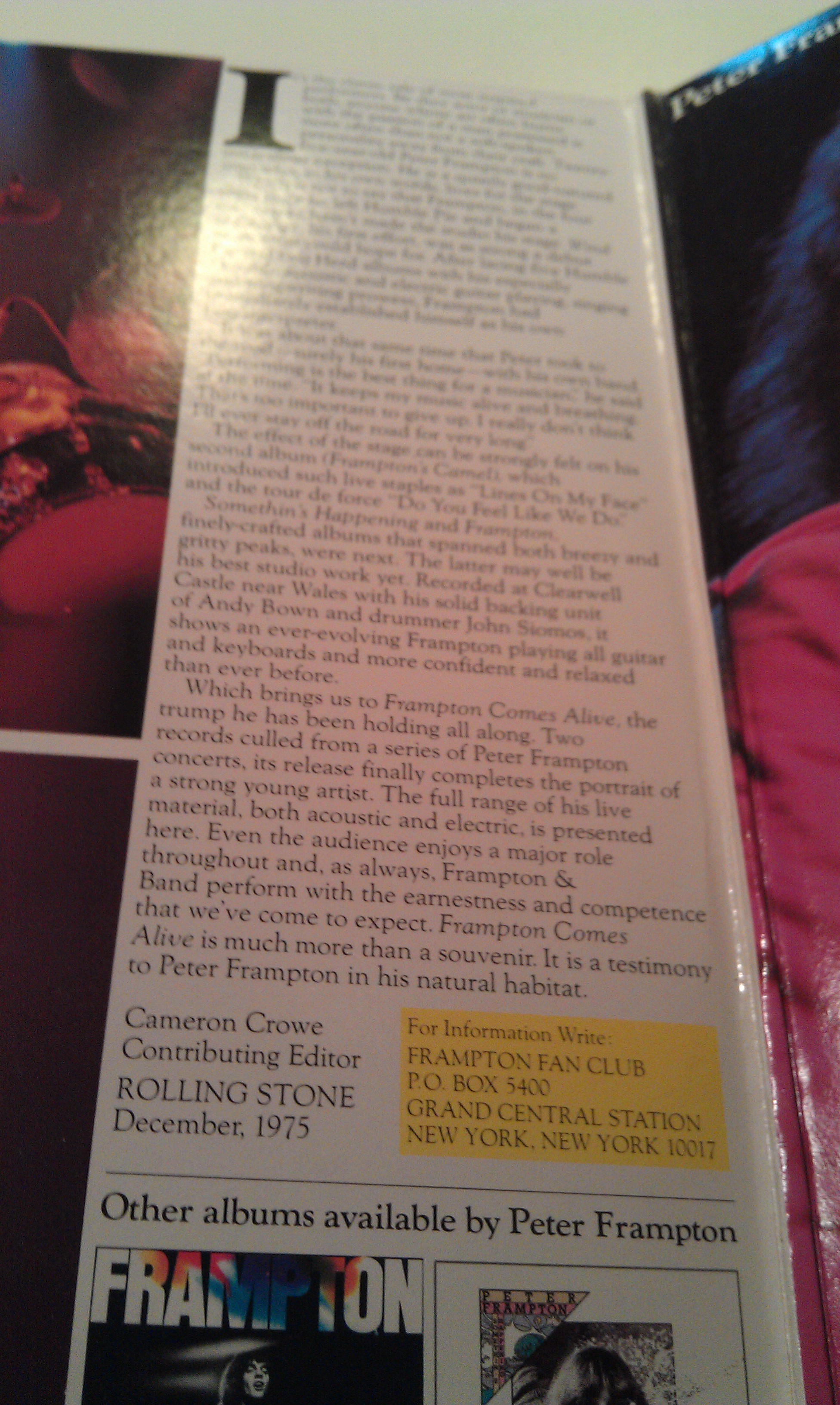 I spent a bit finding the loudest the speaker could handle before starting to sound like crap. Then I took a moment while the song was playing to check out the liner notes. To my surprise they were written by Cameron Crowe. Wasn’t he the Rolling Stone guy that they made the “Almost Famous” movie about. Hmmm…
