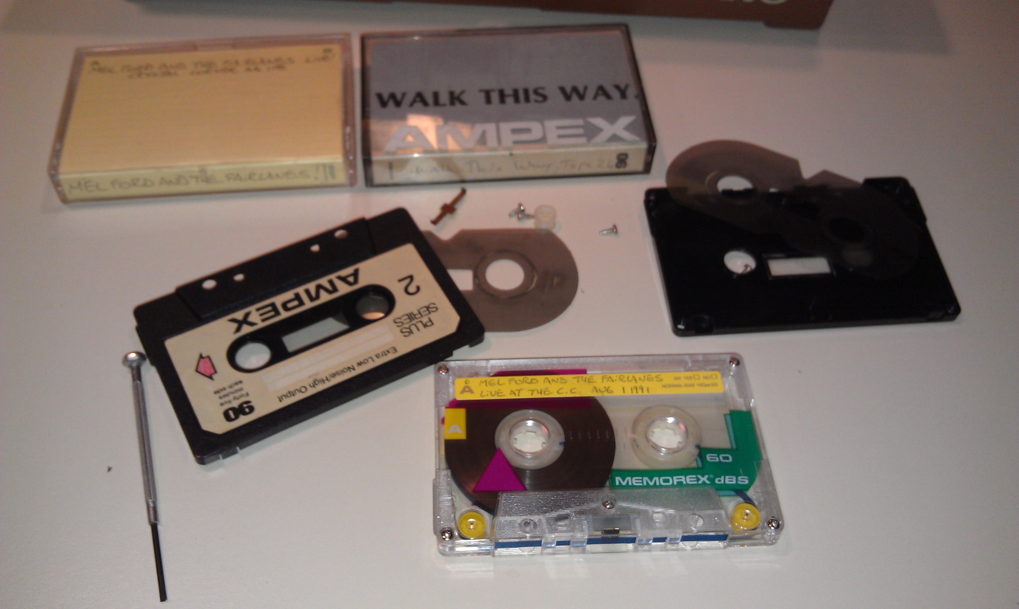 In the old days I had a small box full of spare tape parts, reels, play pads, empty cases and such. This was long since abandoned. I did however have a tape nearby that was empty. This was copy of the Mel Ford and The Fairlanes from 1991 at The Crystal Corner in Madison. I pulled it from Dalton’s magic box of tapes and took it in the van to listen to. Apparently I botched it, because it’s blank. After confirming that I still had my original copy, I decided to use this blank version as a donor.