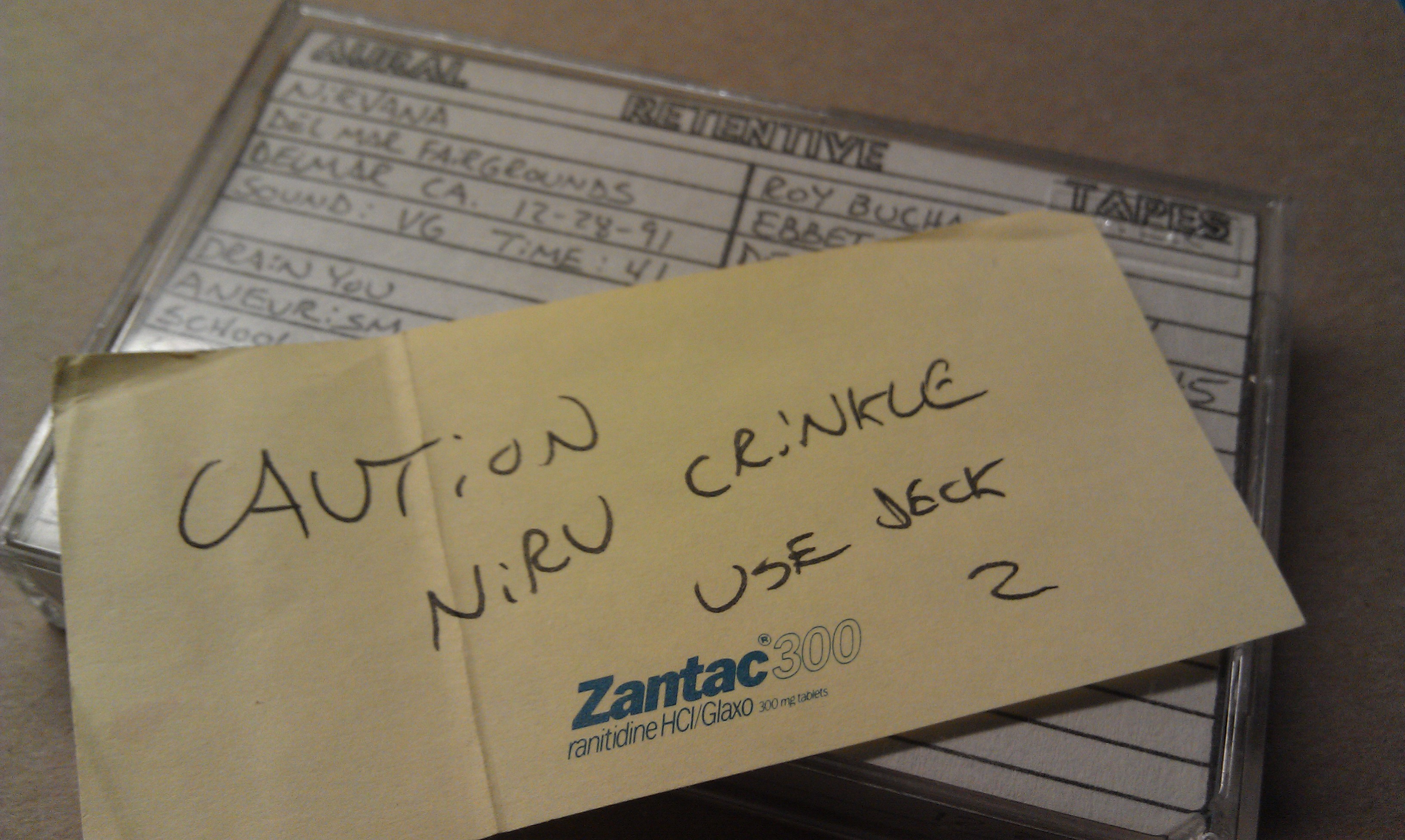 My tape decks were starting to break down, resulting in the loss of a couple of tapes and leaving some with issues. This Nirvana / Roy Buchannan tape had a crinkle in the beginning. Every time I played it on the playback deck it got worse. I had to remember to play it on the recording side.
