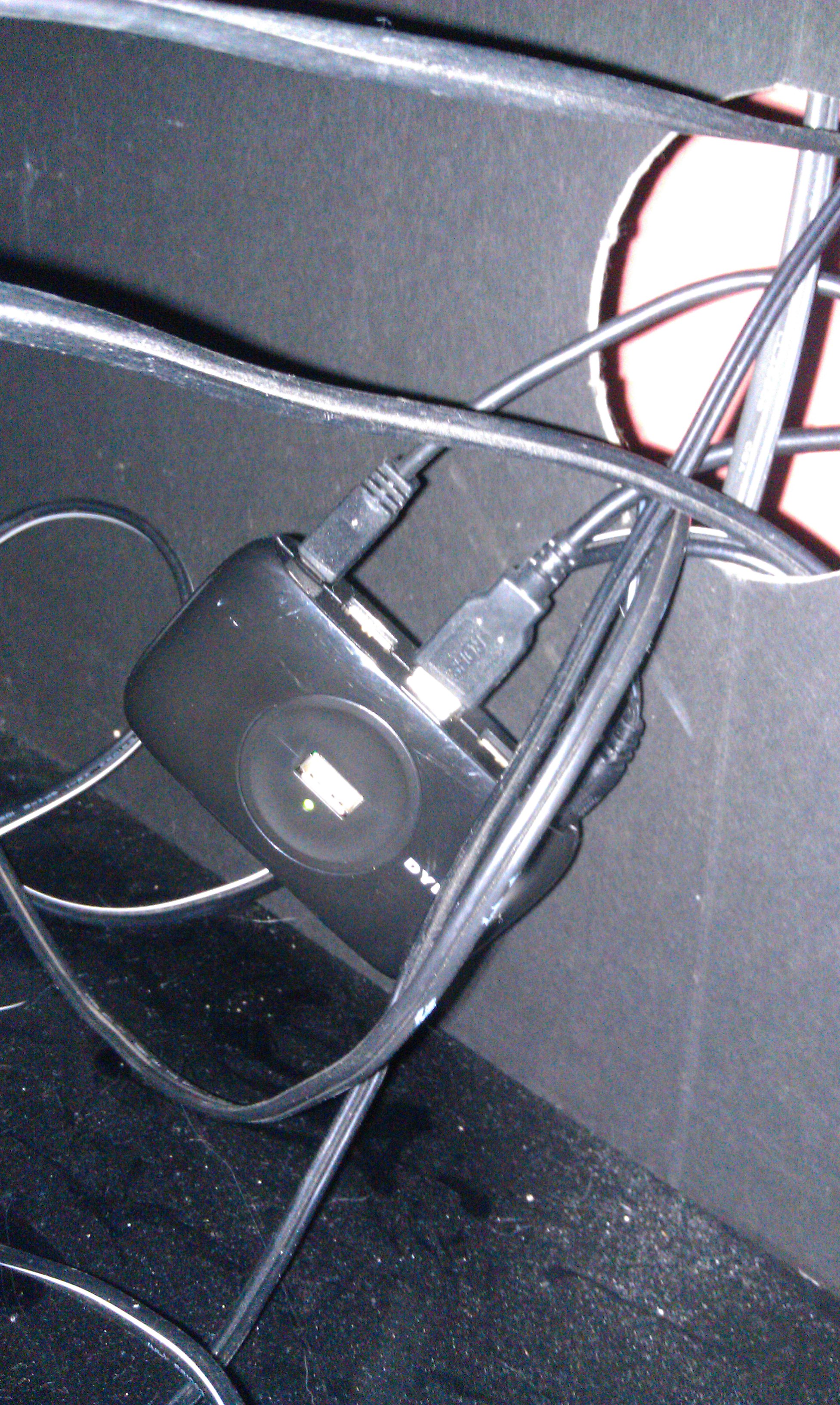 I had it all set up then brought over the Vibe rig. I had a problem. This was a USB turntable. There was no power cord to plug in. I had run it off of my laptop before. Hmm… I guess I hadn’t really considered that. The one Abbey had and the Ion rig had power cords. This one was strictly USB. It was only a momentary setback. I thought about the huge bin of cords and power adapters and misc computer equipment I have. There was a USB hub, one that plugged into the wall. Could that possibly work? It did!
