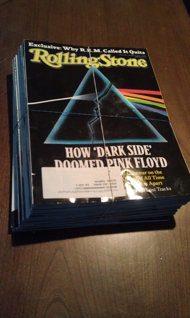 I planned on setting them on the breakroom table. Old news maybe, but if I came to work and found a pile of last years Rolling Stone’s looking for a home I would probably take them. Sigh. Do I hear myself talk?