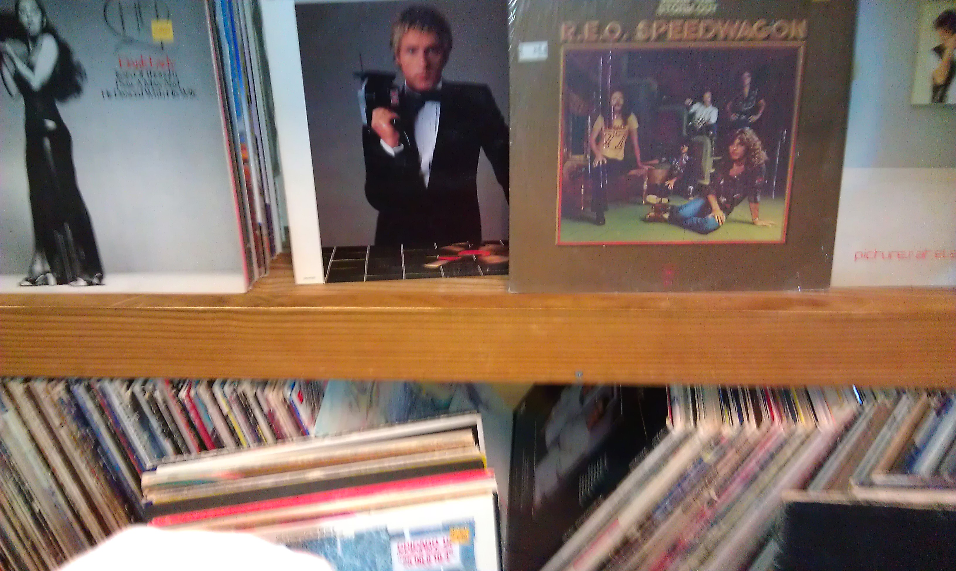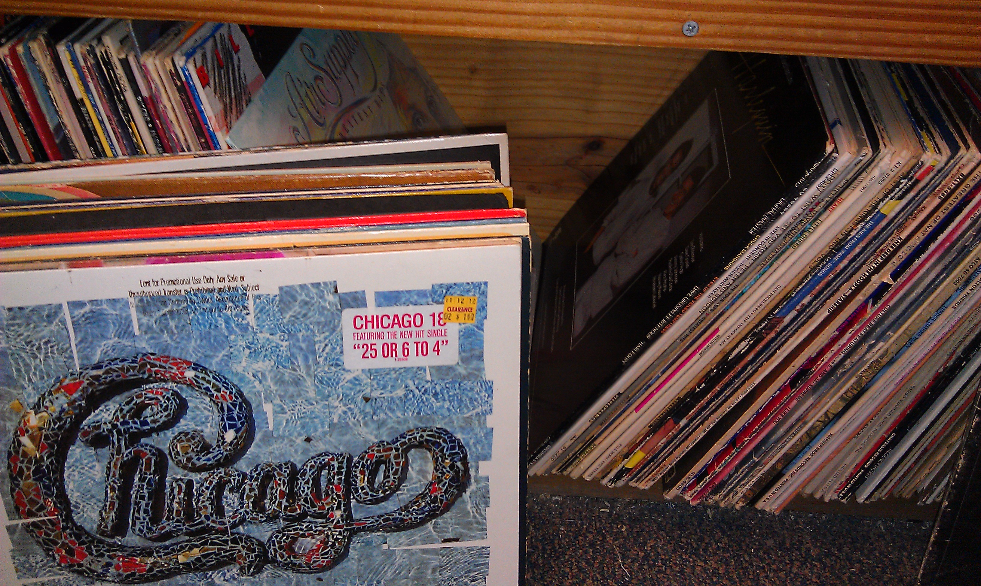 Chicago, Eagles, R.E.O Speedwagon, Phil Collins… they have almost every one. Of course they have Air Supply too. Frankly though, the wretched stuff is in a much lower proportion to the good stuff here. I started amassing a pile halfway through the lower “Discount” shelf. Then I went back across the upper section. More gold there! I found a couple doubles of things I wanted, so when I reached the end of the upper section I took my accumulated pile to an area at the end to the record section and set the pile on the Video Discs (people still buy those) to sort them out. I put back some Billy Squire and some Neil Diamond that I suspected were just greatest hits from certain label years. I checked which doubles looked best, swapped out some inserts and reached my final decision on what to keep. Then I glanced down. The end of the rack was a continuation of the “Discount” section!