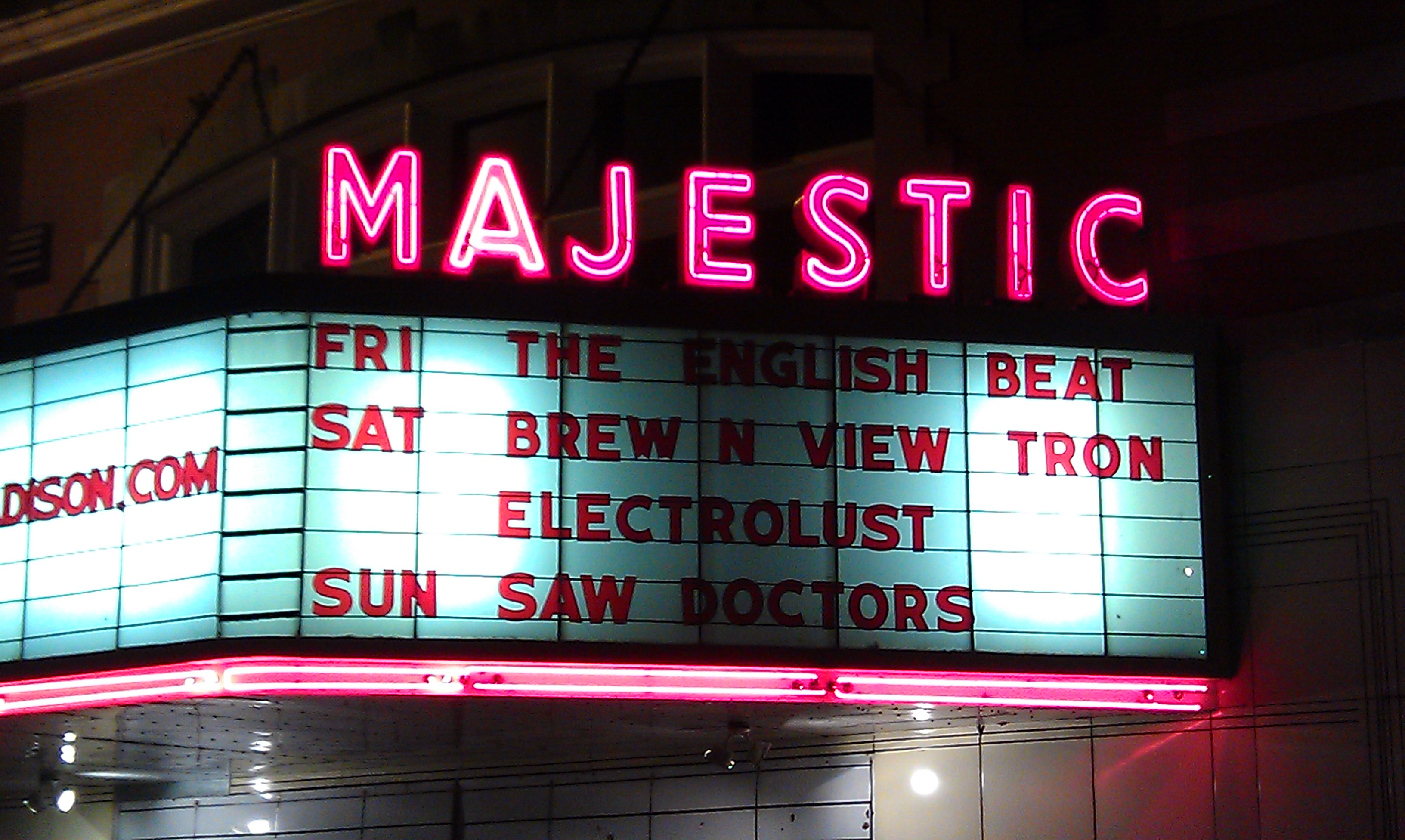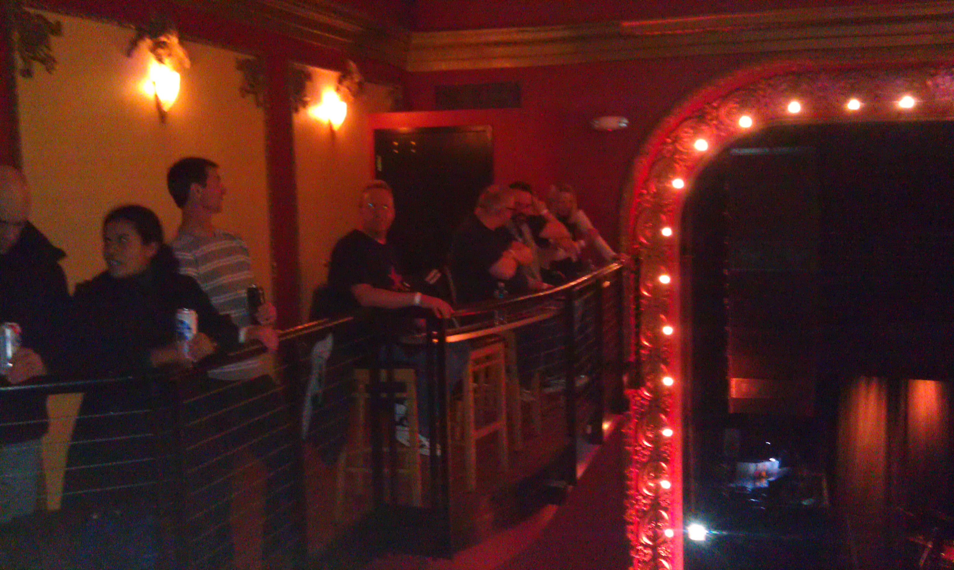 The Majestic is very cool inside. There is a bar and tables and a “dance floor” in the lower space and a balcony above with VIP seating on the right hand of the stage and padded tiered seating directly opposite the stage. The railing goes all the way around the balcony with the left hand side having 5 seats and a drink rail then some plain railing to the corner. That is where we ended up, against the rail next to the chairs. It was a good view actually. It was close and to stage right. Once I confirmed with security that we were not going to get kicked off of the rail, like the rail that goes in front of the balcony seats, we staked a claim at the rail and waited for the opener.