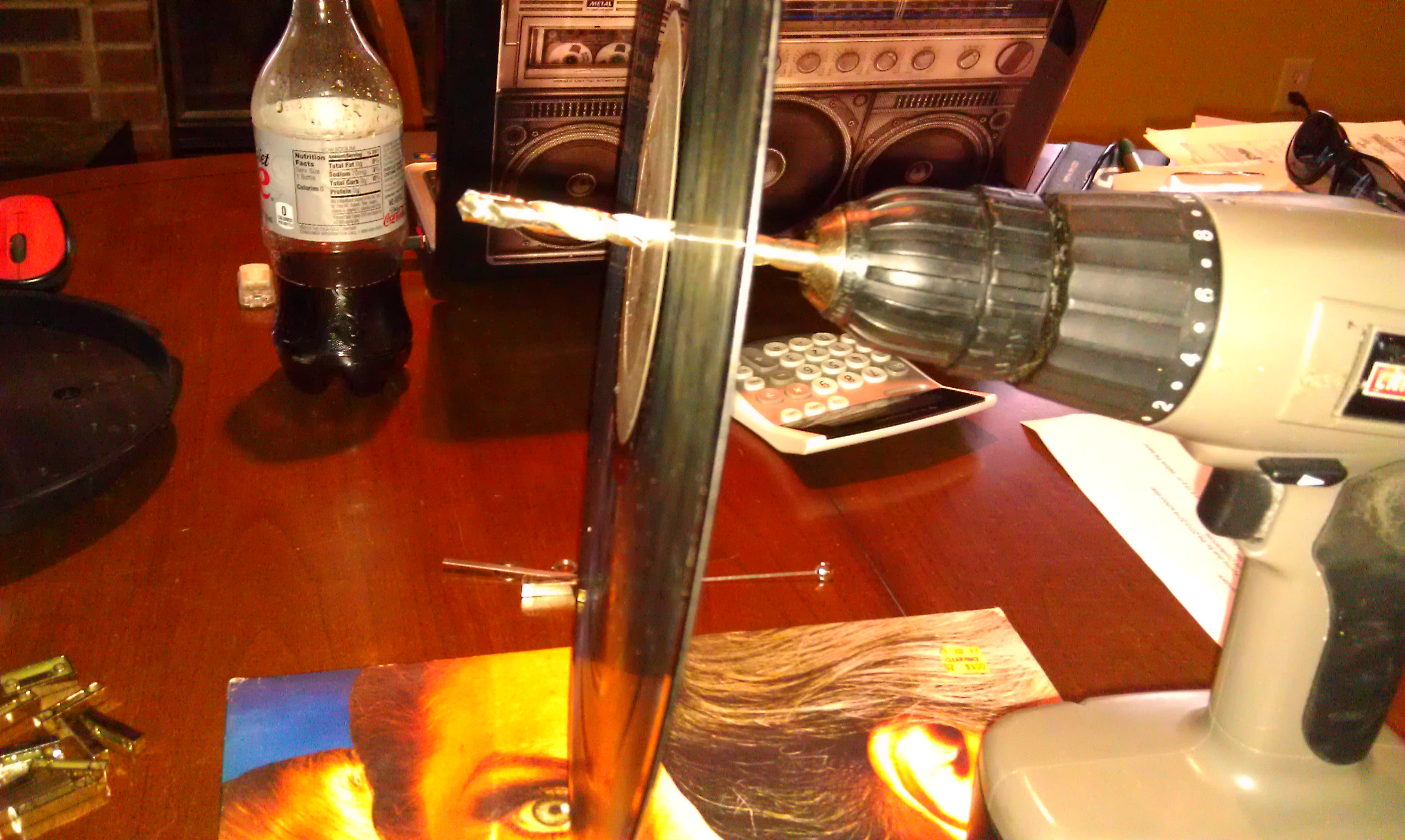 This was a proof of concept build, not a “one for the museum” project. I wanted it to look nice though. So I put the unplayed record on the turntable and cleaned it on the side that was to be the face of the clock. It was in okay shape, in the light you will be able to see scratches and wear, but that will add to the ambiance of the whole project. This album was well played before this new chapter of its life. I brought it over to the pile of clock pieces and tried to put the clock movement through the spindle hole. Nope. The hole was just a bit too small. So, back to the toolbox and I brought the drill over. I picked a drill bit ever so slightly larger than the hole. Drilled it out, and tried again. Still too small.