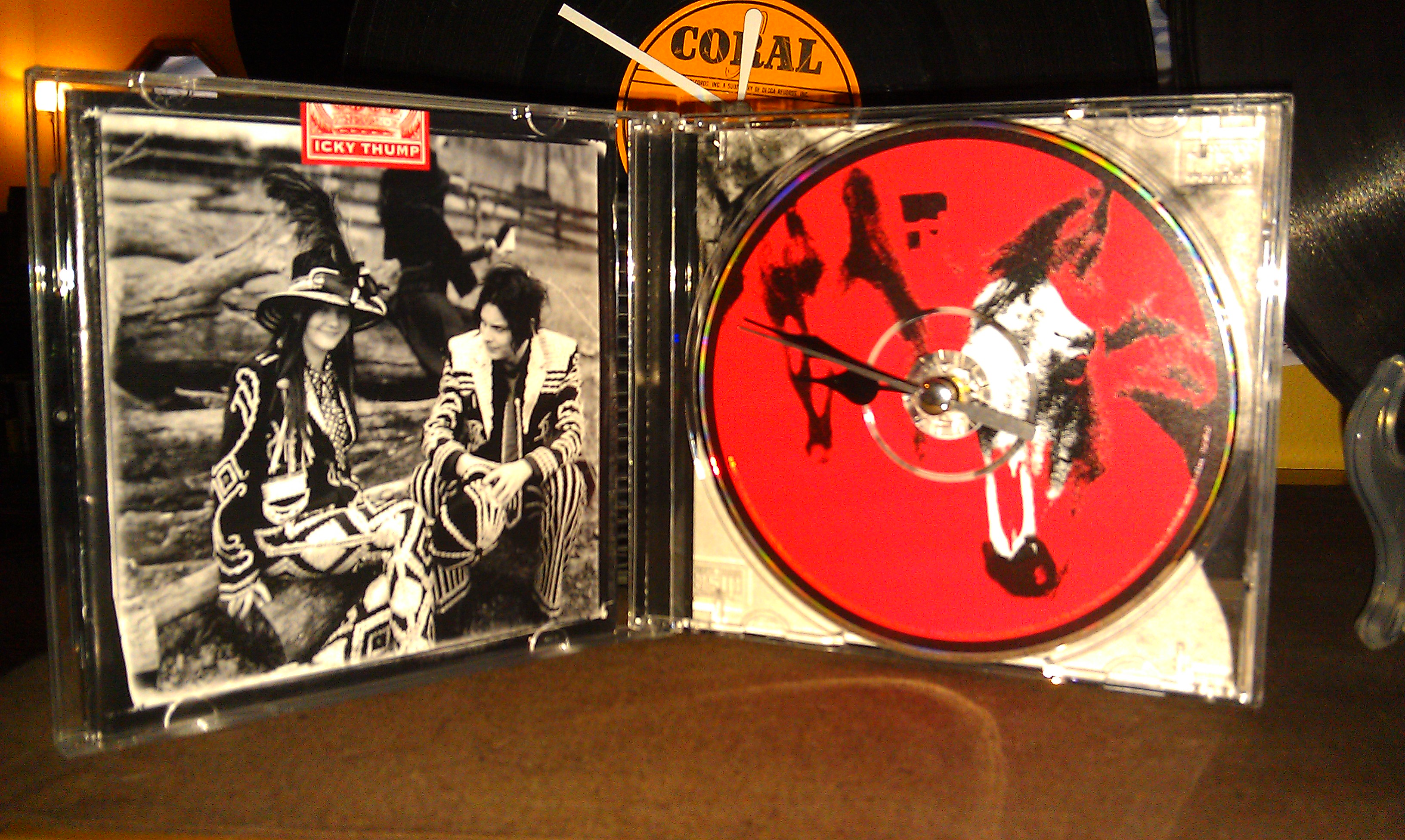I also created a desk clock for my work from the “White Stripes – Icky Thump” CD that Abbey gave to me. The CD is still playable Abbey. Fear not. The tiny little arms looked too small even on a 78. They would only work on a CD, and this was the coolest looking CD of those that I have left.