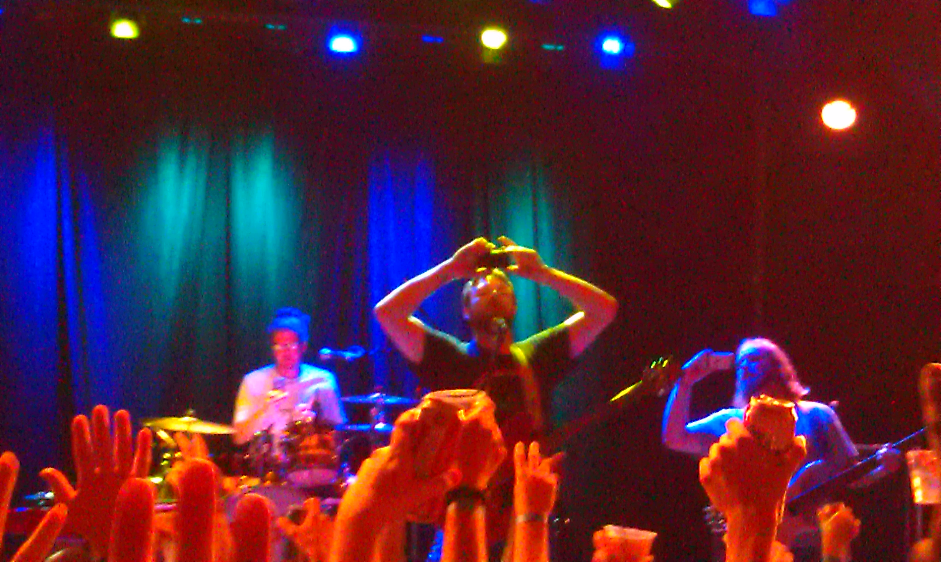 The dancing began in earnest then. There were people jumping, dancing in place and some spinning and weaving through the crowd. It was fun to people watch. One guy that had been dancing off to the side in his own little world, suddenly jumped up onstage and joined to sing a few songs. That’s him in the headband between the guitarists.