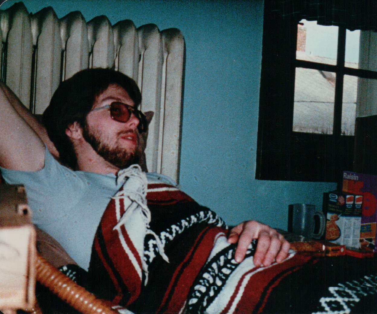 Prominent in this picture is the water heater that I huddled against in the cold winter months, melting on one side and freezing on the other, my tiny window, and the round wicker chair that was my alternative to the floor or the desk chair.