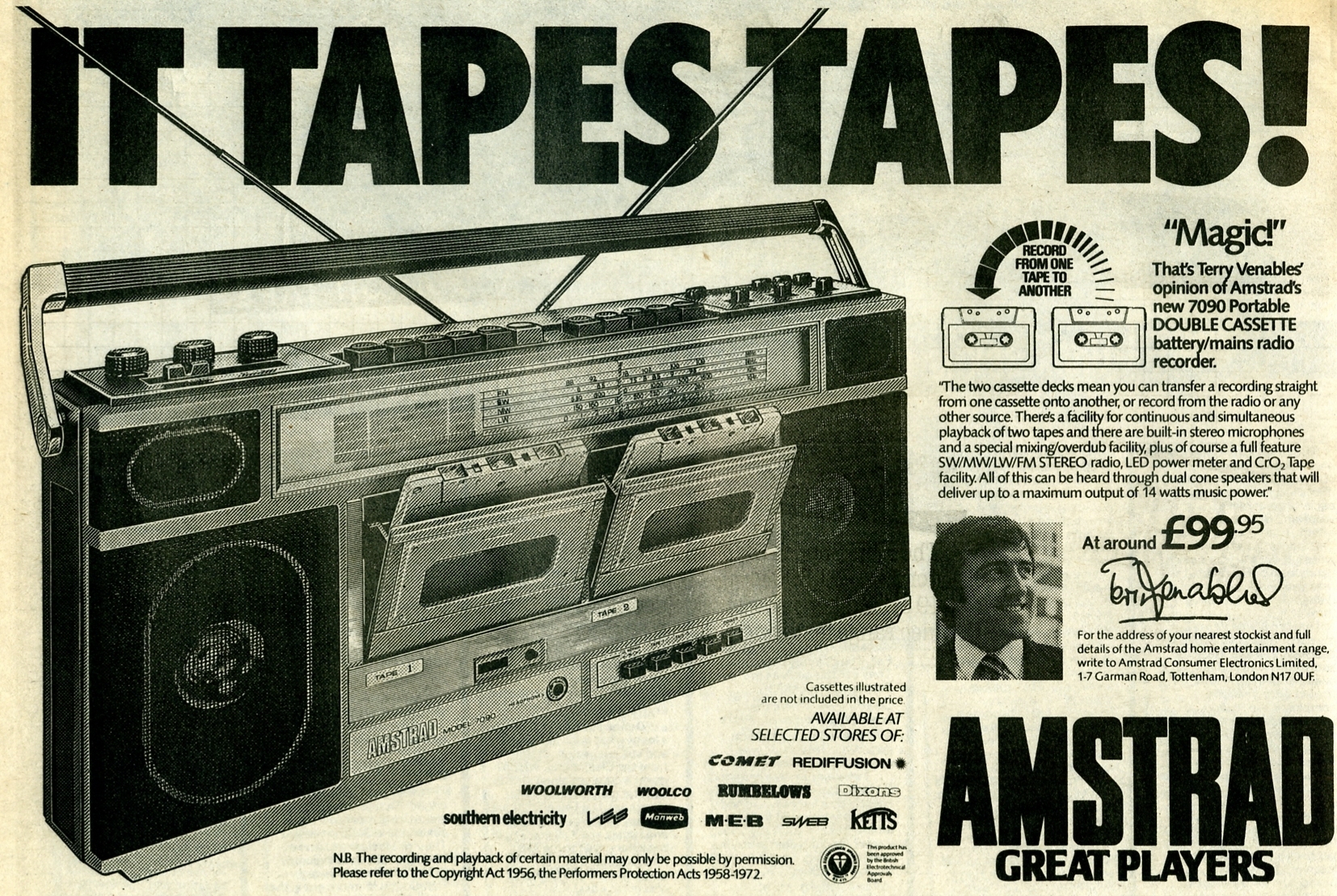 Available at Woolworth and Woolco. Record from one tape to another. With a radio!