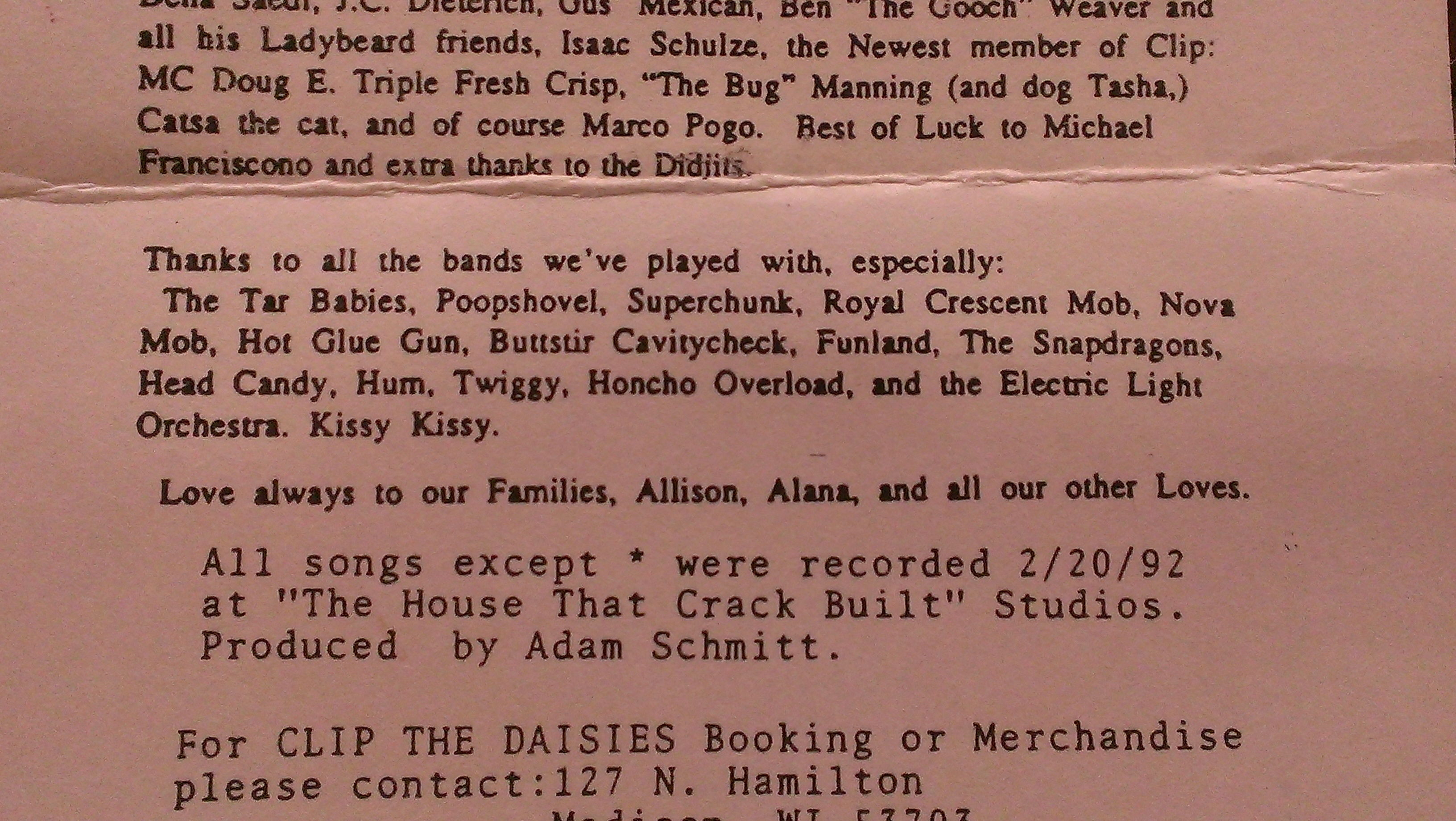 “Clip the Daisies was a band from Madison, WI in the early 1990s, splitting up about 1994. They played jagged, funky, fast rock that often reminded me of a harder-edged Minutemen with every stronger classic rock, and sometimes jazz, influences.