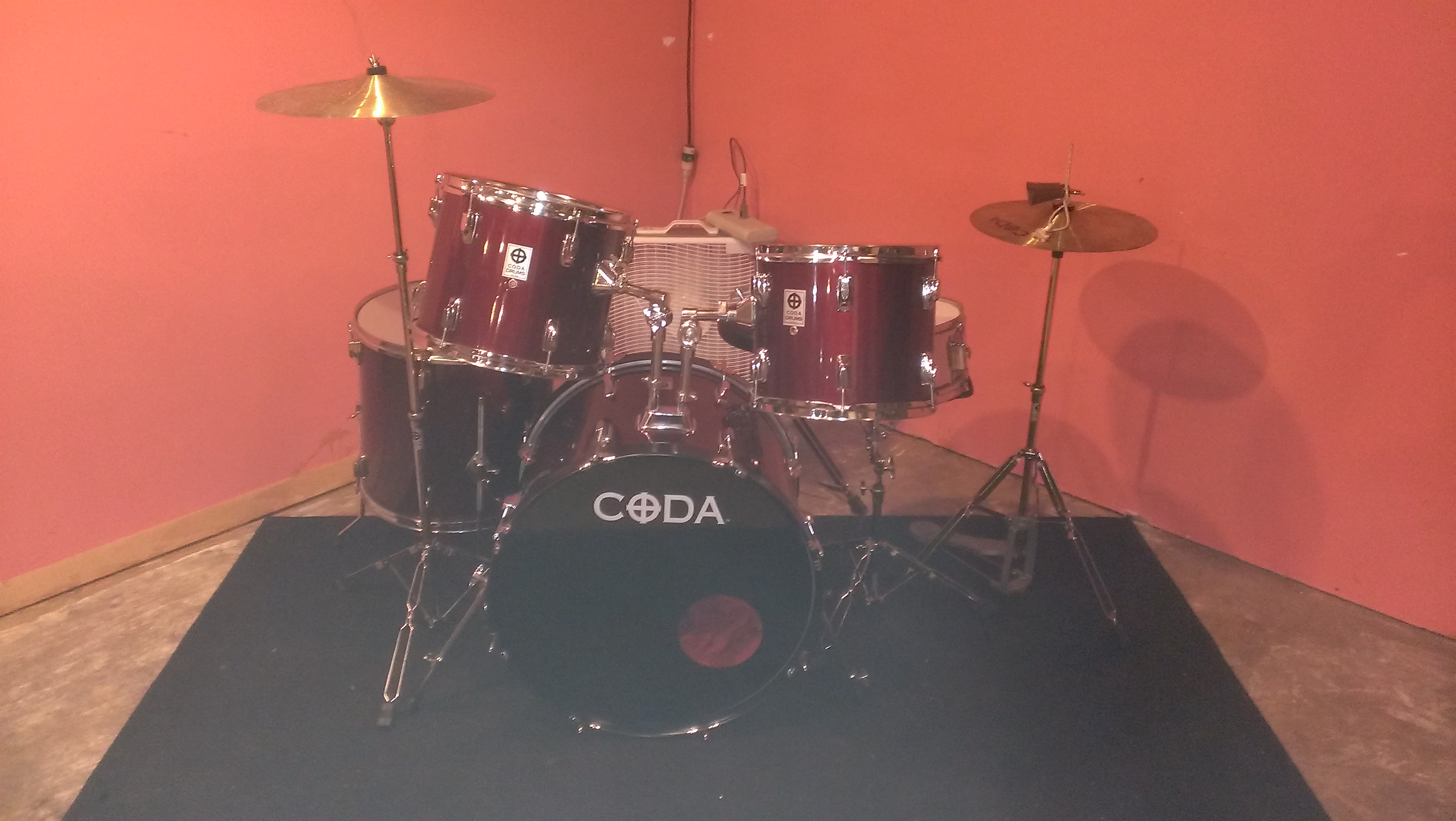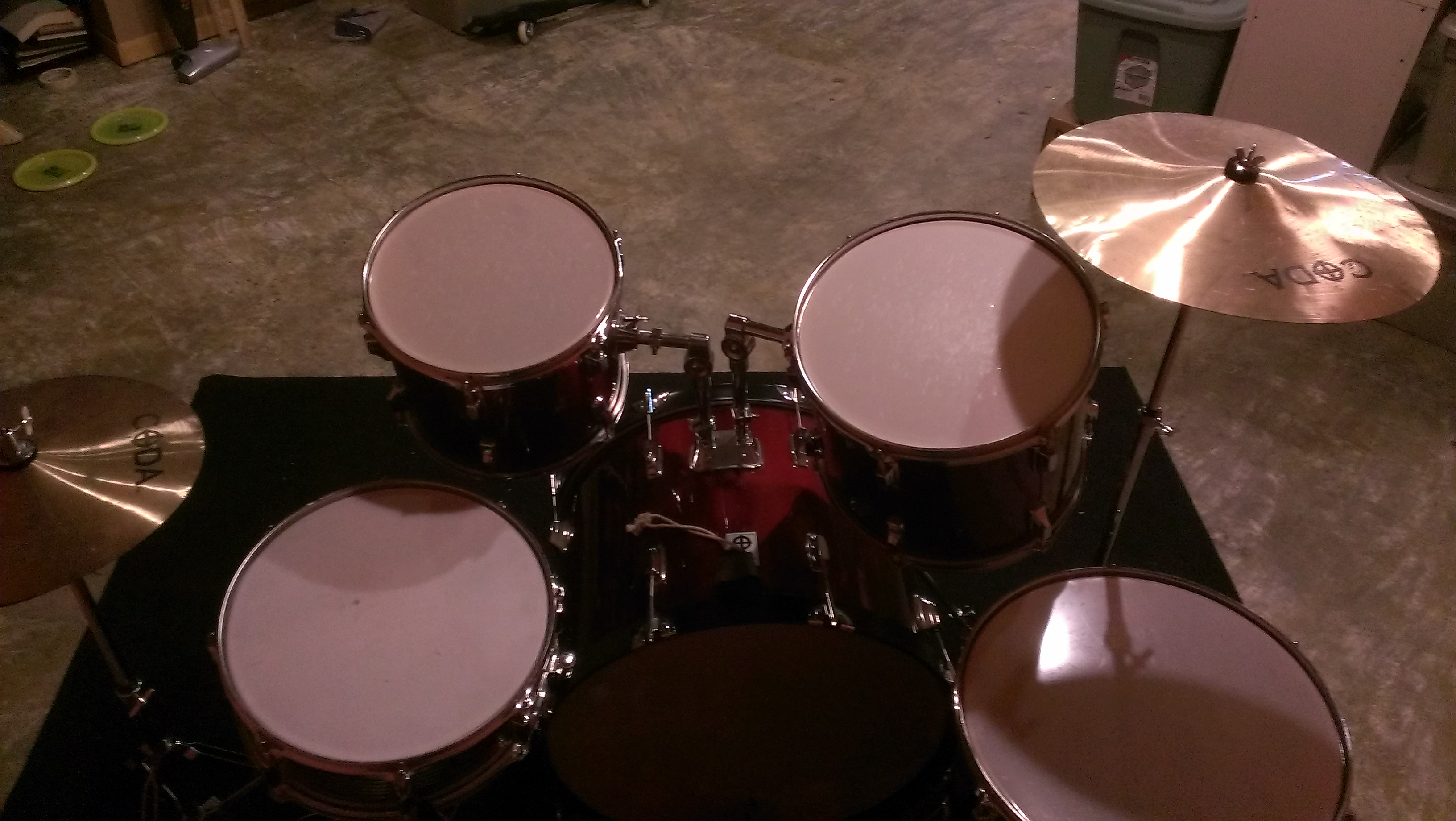 After spending 20 minutes trying to figure out the hi-hat pedal, I gave up and just set it next to the kit. You can still hit it, just not make the tsssst tsssst tsssst sound. Sigh. Before I got behind the kit I took a picture. Do not adjust your gamma, that is the real color of the wall.