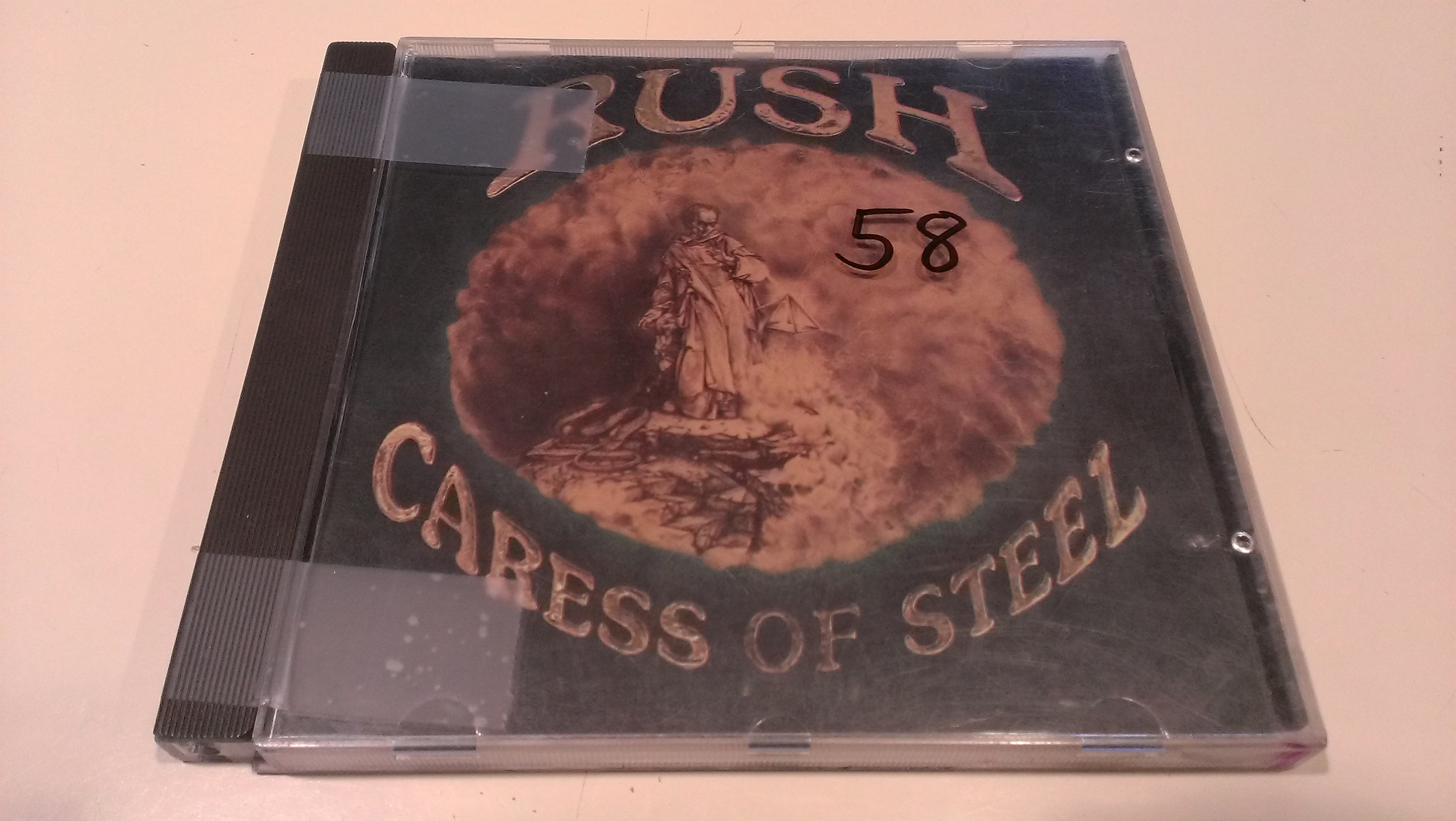 The very first one I came across, laying on its side at the end of a row of CD’s was none other than “Rush – Caress Of Steel”! In my head I squealed giddily and grabbed it. It was in rough shape, with tape holding the broken CD case cover on, and someone had sharpied a big number on it, but this was “Caress Of Steel” I had to have it.