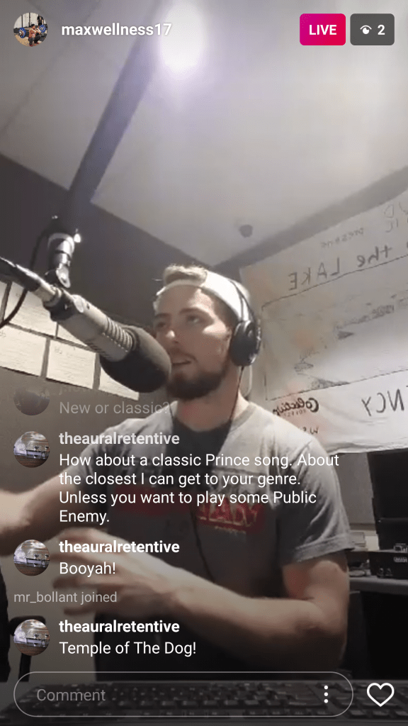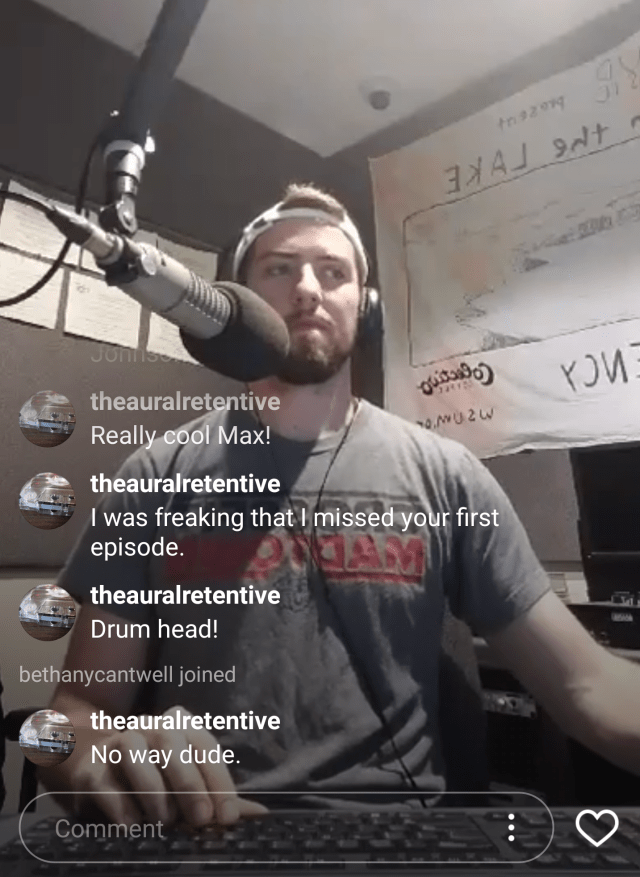 I got notification that Max was doing a live feed on Instagram. Yes, I am privy to SOME modern technology. So I clicked it and there he was in the WSUM studio, on video. He wasn’t broadcasting, but I was stoked to see him behind the mic.
