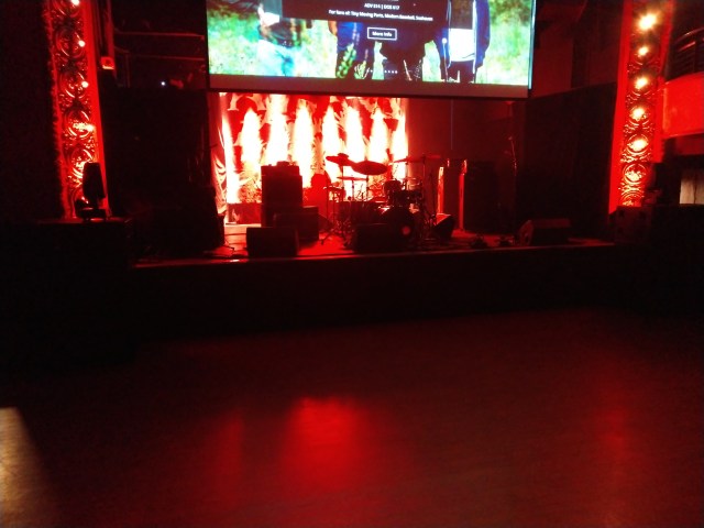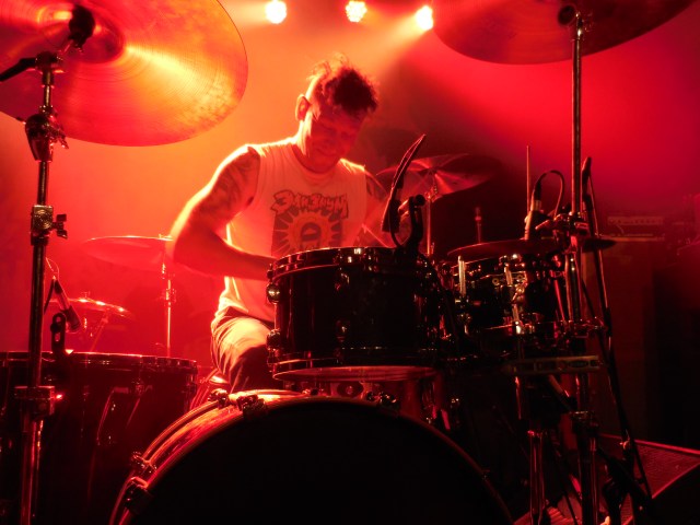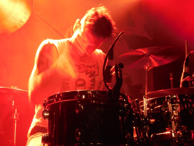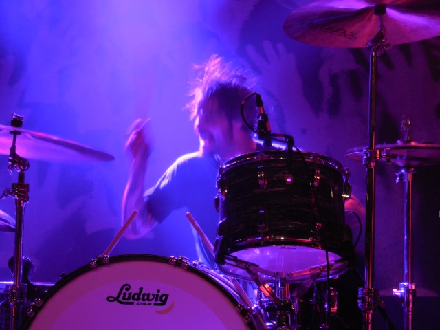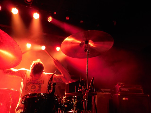 I arrived 15 minutes before doors opened, and I was only the 5th person in line. As I talked about in my pre-show post, it’s always a gamble showing up too early, but I wanted to be assured a stage front position. I got it. Surprisingly, at 15 minutes to show time there were only 20 people inside. I counted. I actually went and sat down at one of the tables and made my pre-show post to keep busy until show time. My eventual spot was there, right at stage front, directly in front of the drum kit, which was about a foot from the edge of the stage.