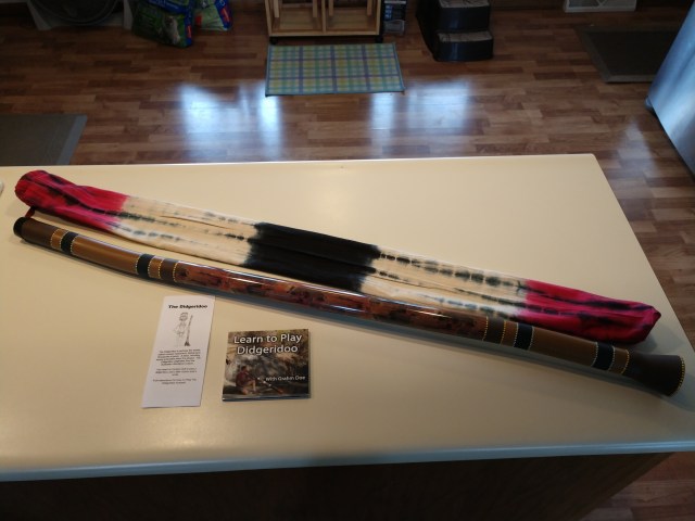 After listening to this music off and on for several weeks, I ventured into the YouTube world and discovered what I consider to be the perfect demo video for didgeridoo. I was fascinated with how the sounds are produced and the circular breathing and the simplicity and rhythm and tone. It is of David Hudson, sitting in the woods, stream running in the background, demonstrating how to play and giving some history. It seems to be a problem putting in a link here so if you are interested, search YouTube for “Playing a Didgeridoo (David Hudson)”.