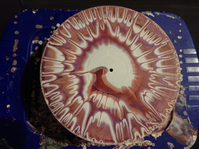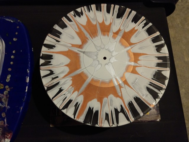 I did a few pours, then had issues with the paint not covering all of the record, either it was the silicone, or some property of the record material, but no matter what I did, small spots formed as it was drying and I ended up with blank space with no paint.