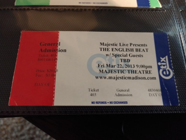 It was in 2013 that I had my first (almost) non-stub show. The English Beat were playing and I bought tickets online and to my horror, the only option was print at home. Ugha.