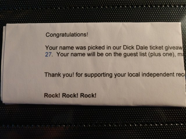 I won tickets to see Dick Dale from Mad City Music in 2015 and my name was at the door. No ticket stub. This was the first.