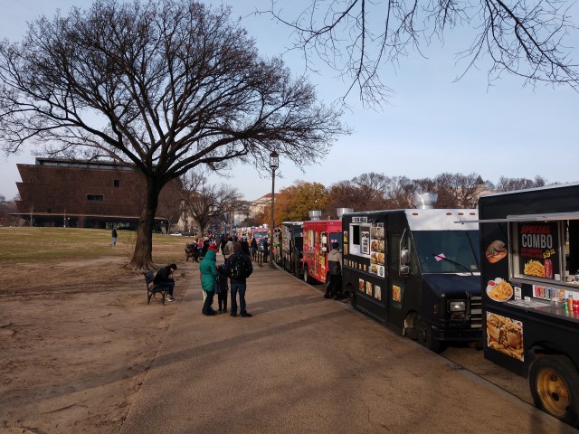 We got outside and I slowly cooled off and donned my outer layers once more. Then we were off to find food. Turns out, food trucks, of which I have seen a few around Madison and certain events around town… are a thing, a big thing around the D.C. area.