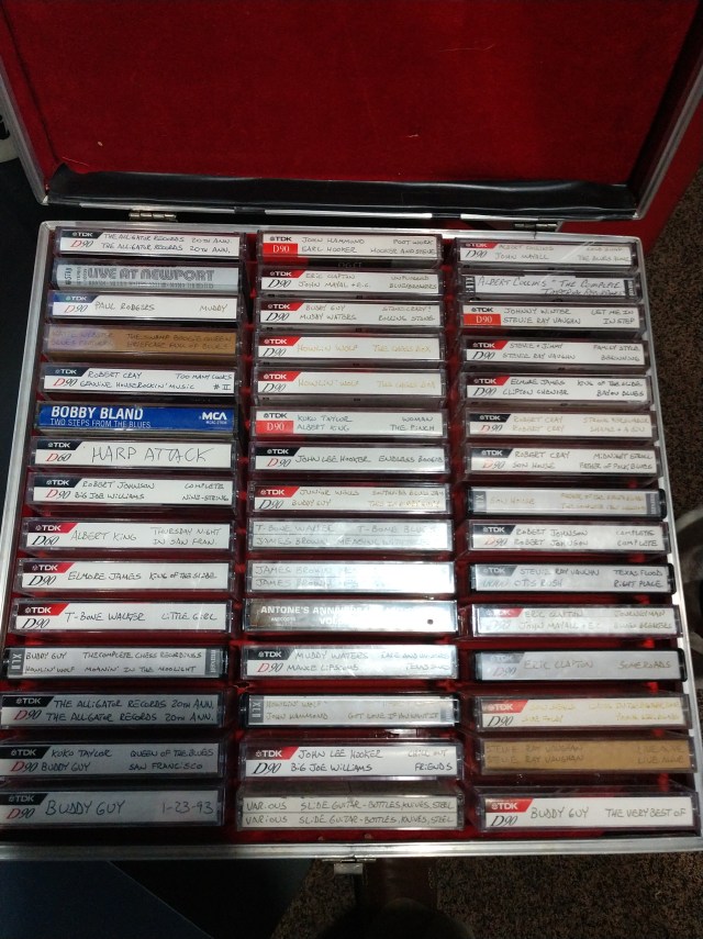 To be fair, the blue basket in the middle is CD’s, but everything else is tapes. Not shown here since it took up too much room was the case of blues tapes. However the 2 piles on the right are more blues tapes that didn’t fit in the case.