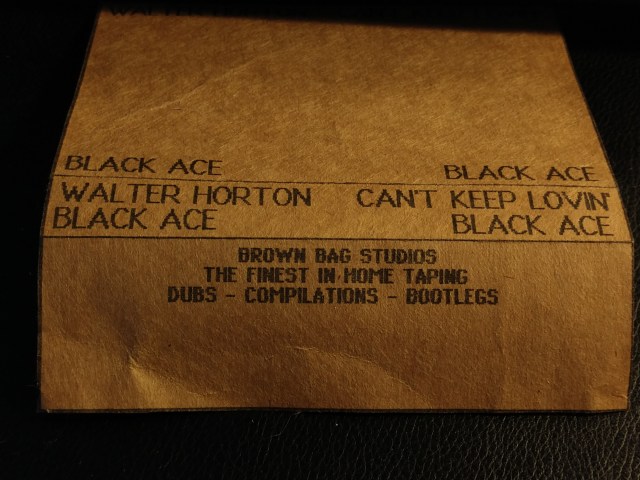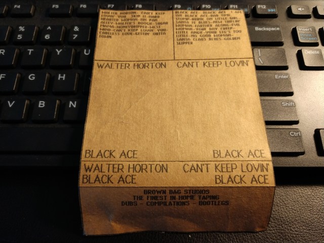 I also have a label from my “Brown Bag Studio” days. This was when I was using old crappy tapes and making j-cards out of paper grocery bags on my dot matrix printer. I loved the uniform look of them on my shelf and have several blues tapes still with these covers. Sadly, Walter Horton and Black Ace, 2 albums I recorded from Madison Public Library vinyl, seem to be missing.