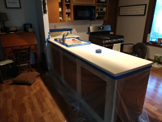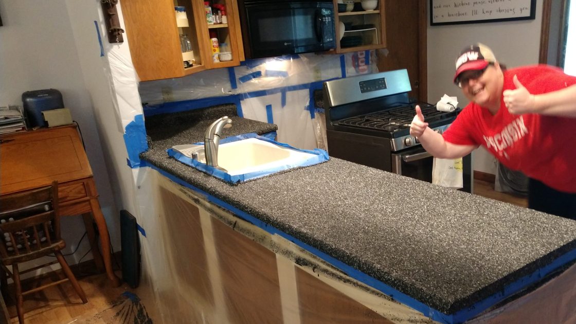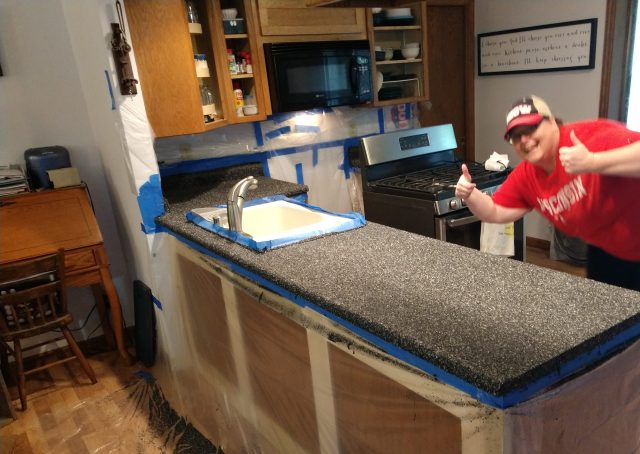So we embarked on a kitchen counter transformation project. First strip down the old, then add adhesive coat and sprinkle (dump more like) colored chips and viola… a new kitchen counter top is born.