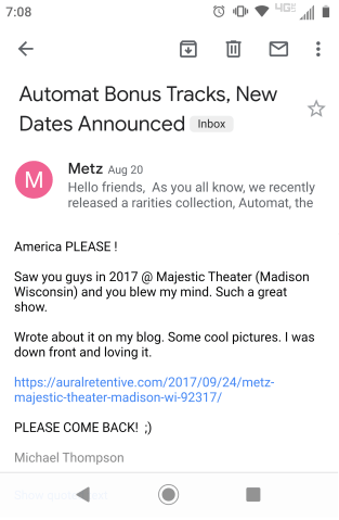 with a plea to come back to America and do some dates. I saw them in 2017 and it was amazing. I know that 99.9% of these types of e-mails rarely hit the mark, but why not.