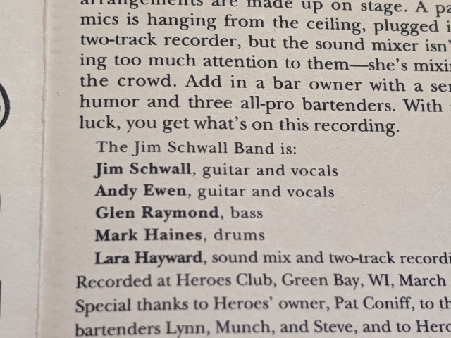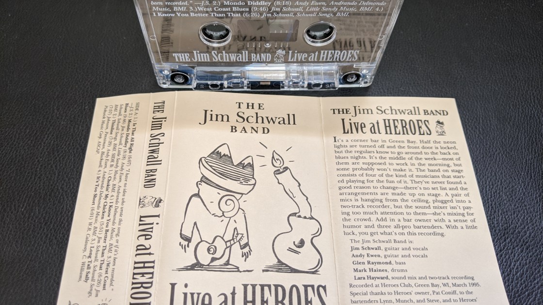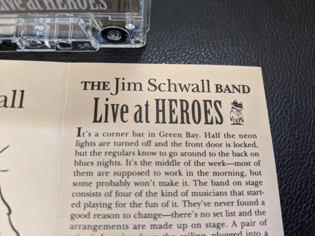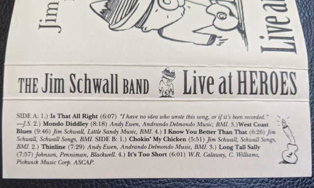 On this last trip I spotted the name Jim Schwall staring out at me from a cassette spine. It said Jim Schwall and Live At Heroes.