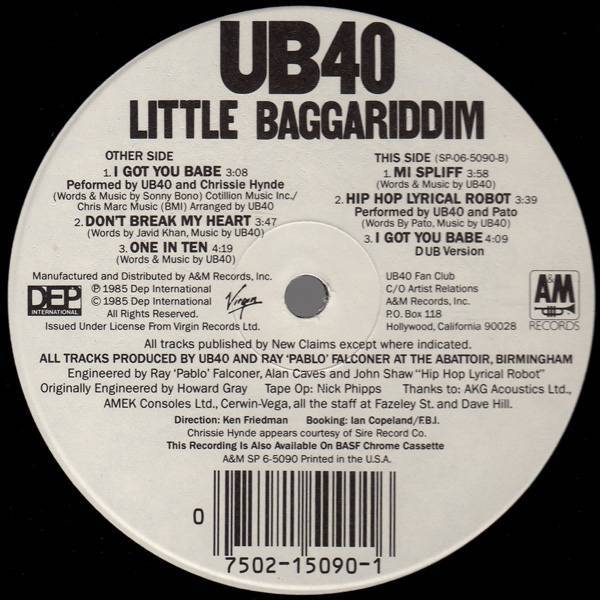 “Don’t Break My Heart” is a slow dreamy thumper that leads into “One In Ten” a bit of social commentary that made me dream of playing bass. Side 2 (or This Side) has “Mi Spliff” an bouncy ode to ganga followed by “Hip Hop Lyrical Robot” which is a rap by Pato Banton who later did a track for The English Beat and then went on to a solo career. Then a dub version of “I Got You Babe”. A great little set of music.