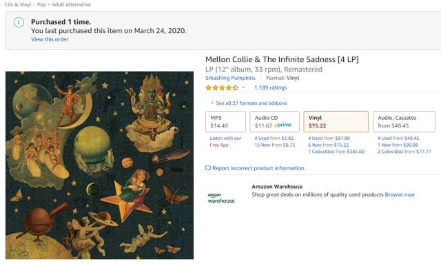 In the past I have had my finger on the button to purchase this album for ~75 bucks… and could never bring myself to actually buy it. I waffled on whether it was responsible to spend that much on an album. Even a Smashing Pumpkins album. Up to that point, a bootleg copy of “Naked City” a John Zorn band, which I paid about $40 for was the most expensive vinyl purchase I had ever made.
