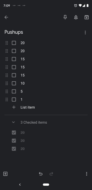 I did reach at one point 25 in a set, to see if I could, but 20 is a good set for me. Pretty consistently doable and a nice chunk to check off. I was forgetting how many I had done sometimes, resulting in me having to create a system of recording quantities on my phone in Google Keep. Check the box for quantities done. No losing track and having to do extra when you questioned yourself. Here I have done 60.