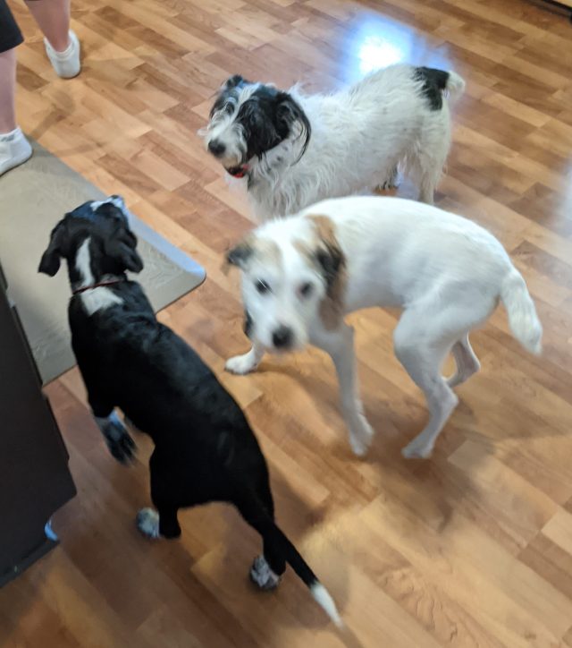 What followed was a tense but improving melding of the 3 dogs. We went from snarling nipping barking ferociousness to tolerance and brief reminders of just who is the lead dog (I think they all think they are) to combined walks and some cautious investigation. All pretty standard and fairly successful for 2 OLD dogs and one puppy. There is still room for improvement, but I suspected it would take weeks and weeks, so I’m happy. Apparently waiting for food is a cease fire moment where the melding process is starting.