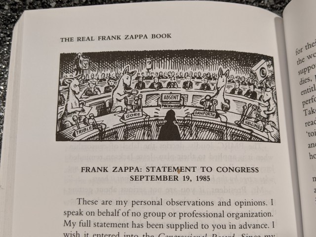 He has always been a voice for freedom of expression and has often railed against the system. There are several chapters in this book that speak to the plight of bands bending to the will of the corporations and in the end not being true to themselves. In the 80’s Frank was called upon to speak to Congress during the whole PRMC debacle. There is a chapter that reprints that speech. Though you have a vision perhaps (due to his rather goofy nature) of a crazed musician, he is very well spoken and articulate with some great points into the guts of the PMRC. It is well worth the read.