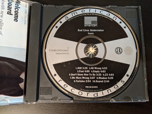 I bought this CD when I visited Alan in San Francisco. I was amazed by the area and made sure to get Alan to take me past a record store. Can’t remember what it was called but I got 2 influential CD’s there. I wasn’t yet back into vinyl. I picked up Green Day’s “1,039/Smoothed Out Slappy Hours” and with a bit more loose money in my pocket I flipped through a bin of CD’s with no covers, used I presume. There was a lot of drek in there, but the prices were crazy low and I decided to take a chance on one I didn’t know. “God Lives Underwater – Empty” seemed intriguing. I had no idea who the band was, had never heard any songs and it was a total blind buy. However, it turned out to be a good one.