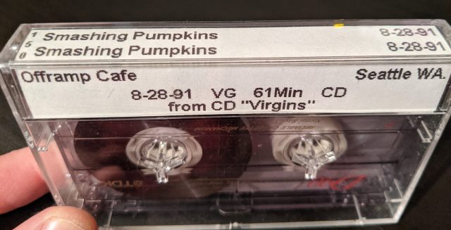 I suddenly remembered having one Smashing Pumpkins bootleg tape. I got it from a guy that had a couple CD bootlegs that he got from another guy and we got to talking one day at the factory and he mentioned he had that and a Grateful Dead bootleg CD. I thought I had found a local source for more bootlegs(!), but after we discussed for a bit it was clear he was not really a collector, but just had a couple that he had picked up randomly from friends. Regardless, he let me borrow and record them.