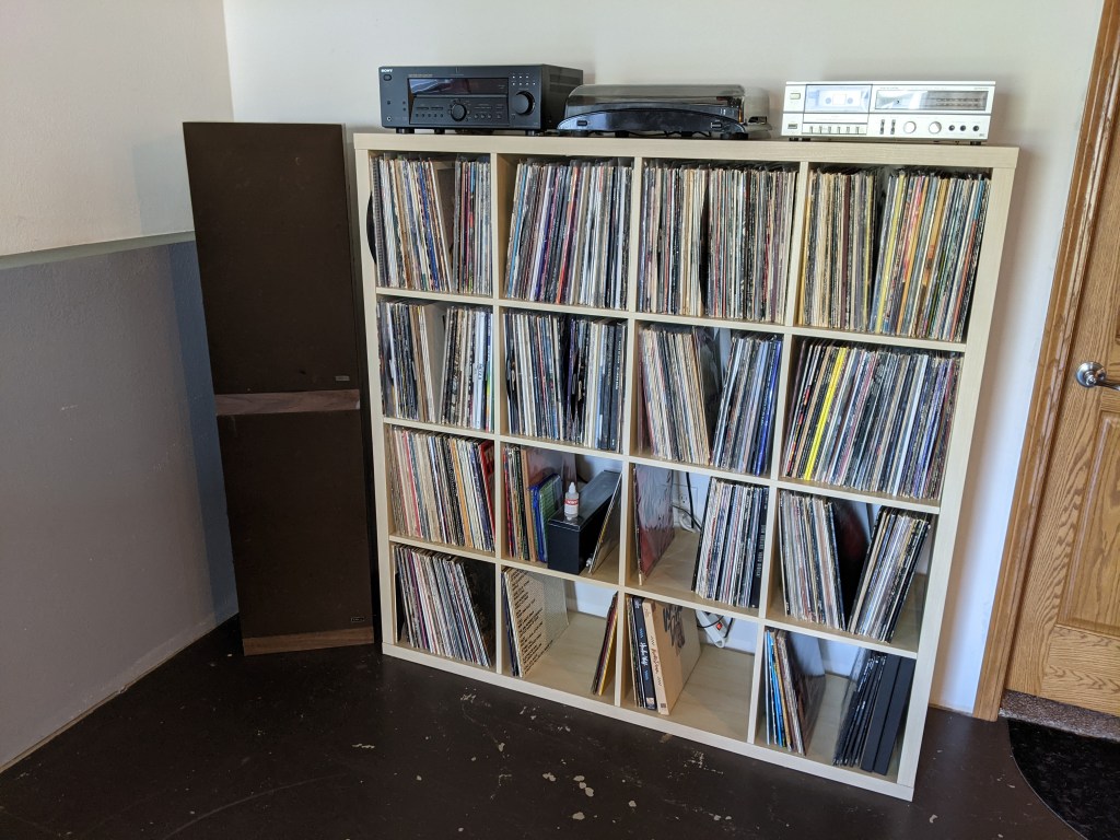 So… with renewed vigor I brought the large kallax, which is somehow still more than 3/4 full out into the main room of the downstairs and set up a receiver, newly working again record player and another tape deck.