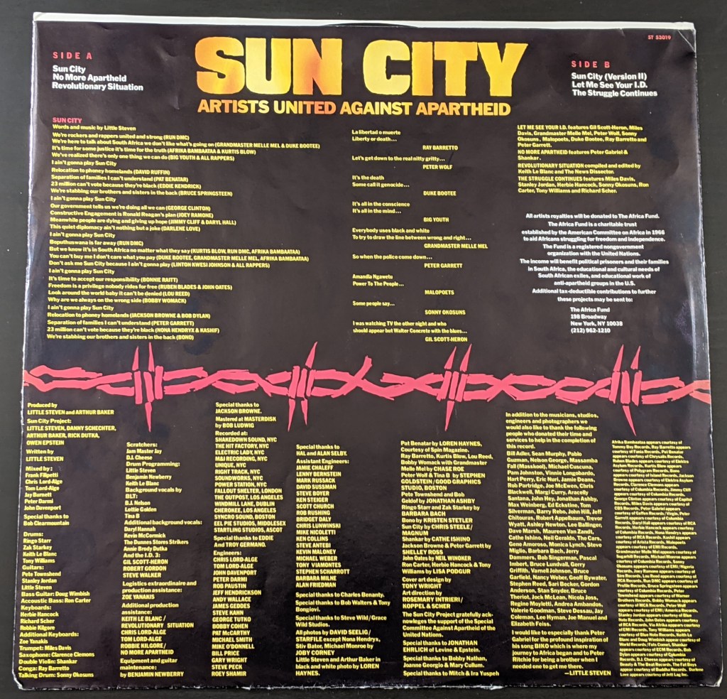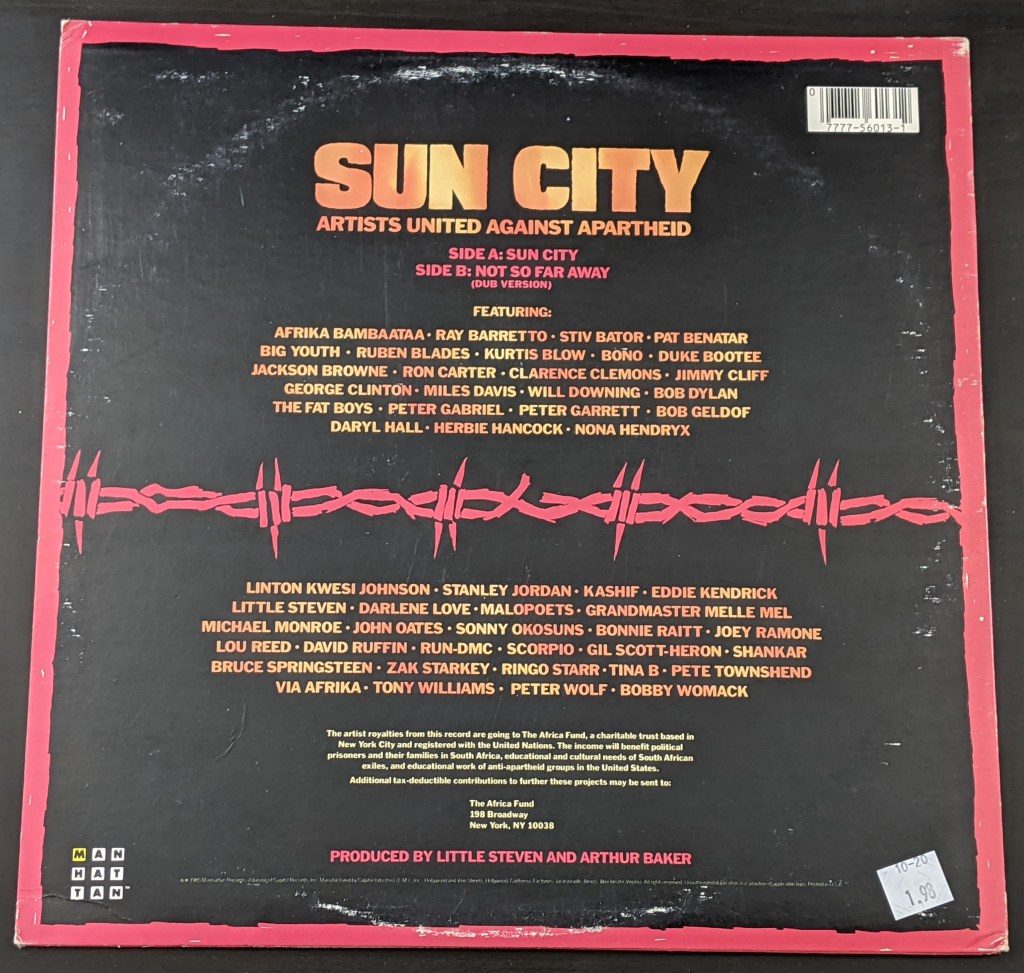 I recently came across a 12″ single of the track “Sun City” and picked it up.