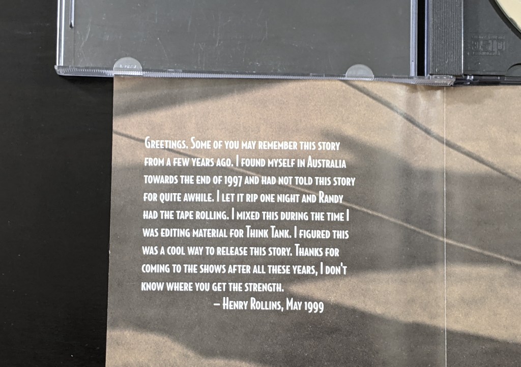but it’s not the full version, or perhaps it was at another show. At any rate, the CD is the story from beginning to end and is in my opinion a true Henry classic. It hits all the high notes in his story telling. I won’t give too much away, but Henry has a very very strong work ethic and has rarely missed a show, and this story highlights his efforts to make it to a gig. It was recorded during an Australian show.