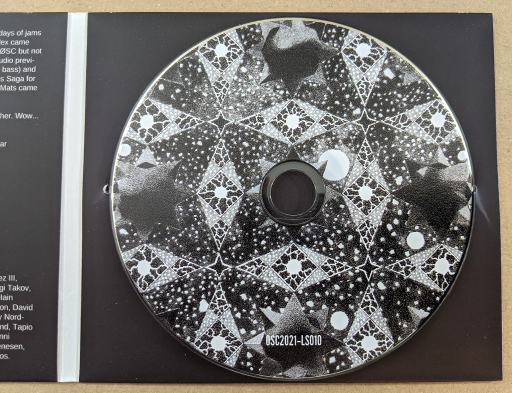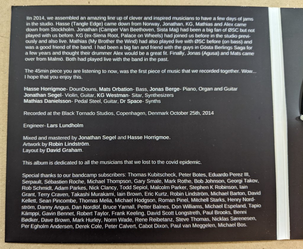 I got the CD version, which is now sold out on Bandcamp, because I am a subscriber to Øresund Space Collective! What a cool bonus. Dedicated to “all the musicians that we lost to the covid epidemic.” Extra bonus… all subscriber names are included in the notes for the CD.