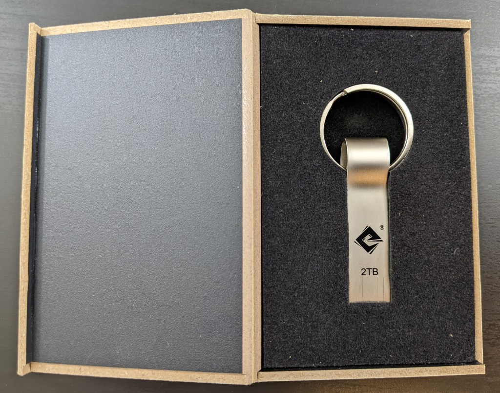 Inside? A metal sleeved with keychain USB with 2 Terabytes of storage. OMG.
