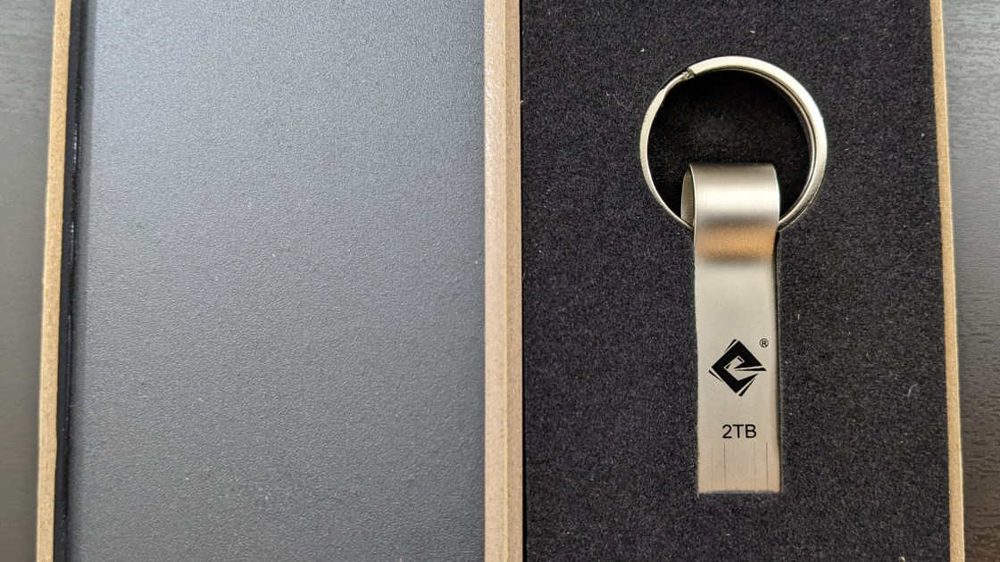 Inside? A metal sleeved with keychain USB with 2 Terabytes of storage. OMG.