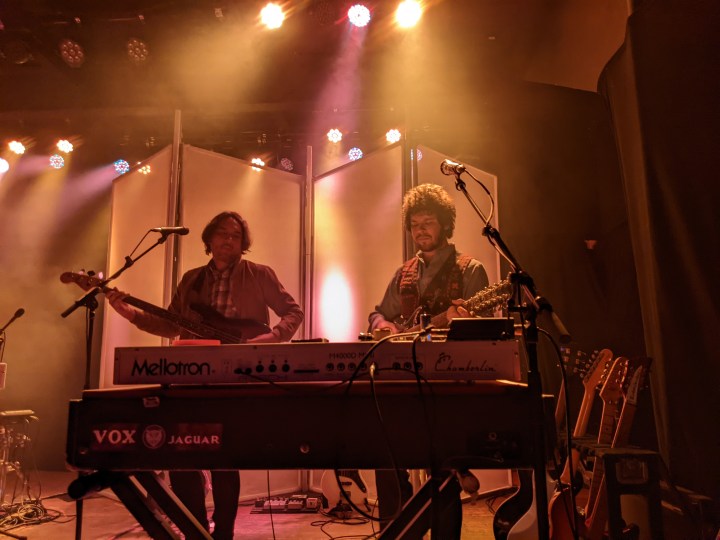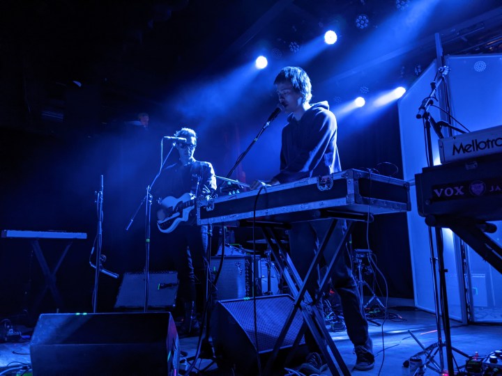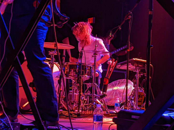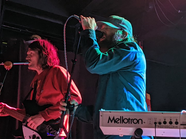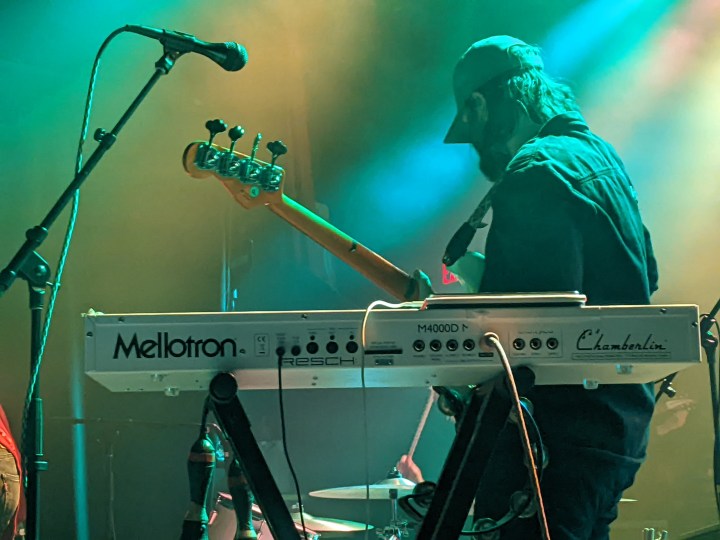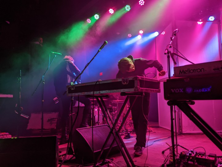 By the end of the first song “Departure” which included liberal use of the cymbal, I was into it. The guitar was a bit hard to hear from where I was at but when I did hear it it was jangly and driven. Good stuff. They traded vocals and the boom from the keyboard beats was intense. Below you see Brian keyboarding and smashing that cymbal for all it was worth.