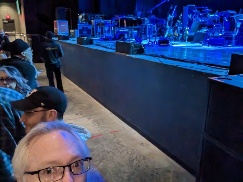The “Fast Pass” line entered at 6:30 and THEN our line went in. I thought that there would be absolute zero chance of getting on the rail as I finally got in and headed down front. There were people 3 deep in the middle, but it thinned out on the sides. I found a tiny spot! I was on the right but still in full view of Bobby’s mic stand. I was surprised and satisfied.
