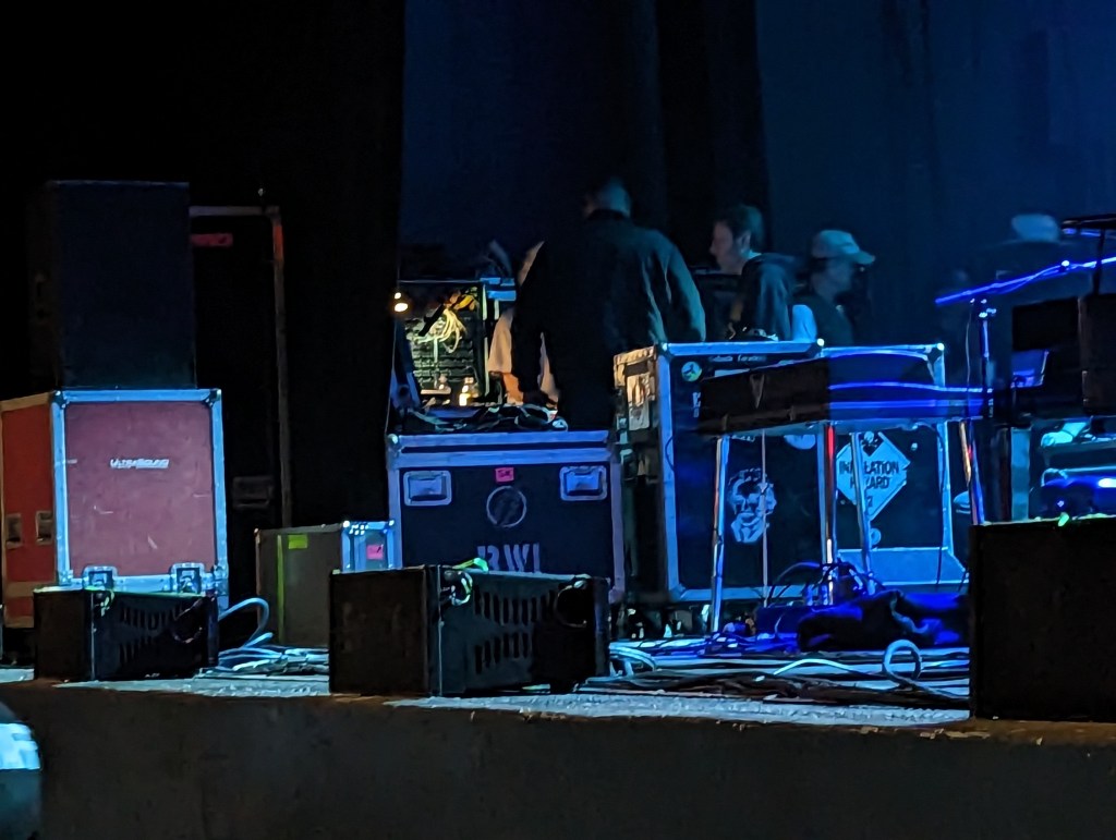 The stage seemed pretty simple, but the light show that was to come was a nice bonus. At around 8 the smoke machines kicked in and about 8:10 there was a huddle with Bob on the far side of the stage. I likened it to a football huddle. You can see Bob’s gray shirt closest to the light.