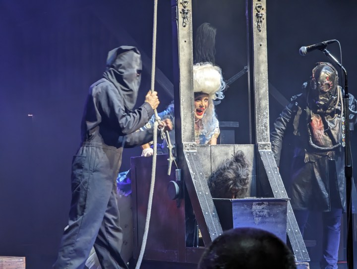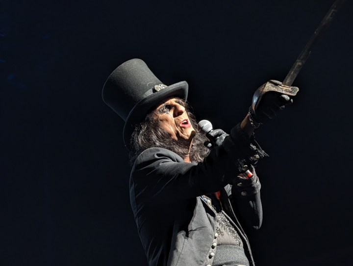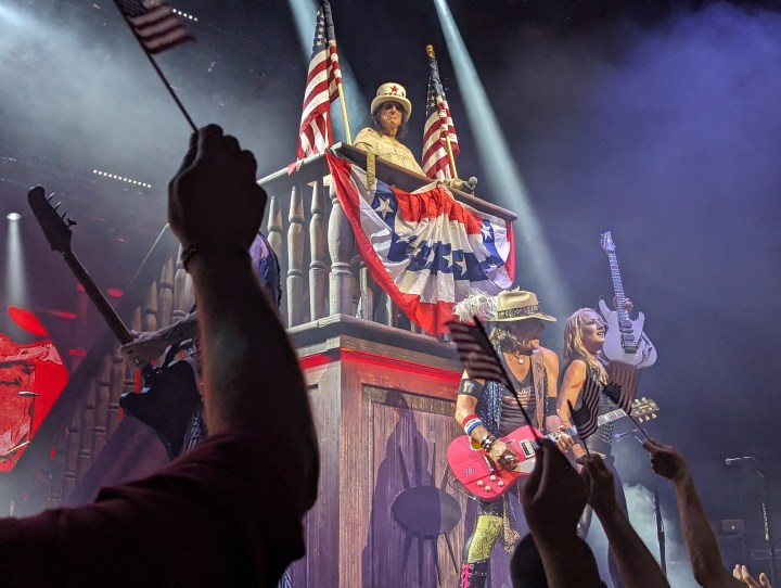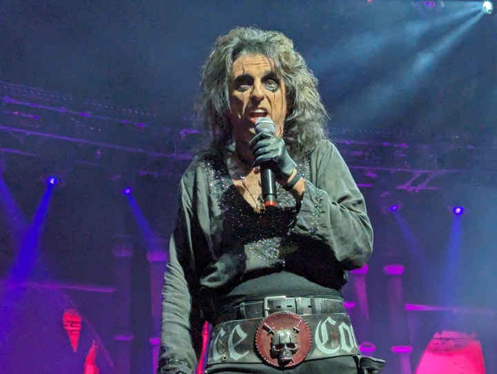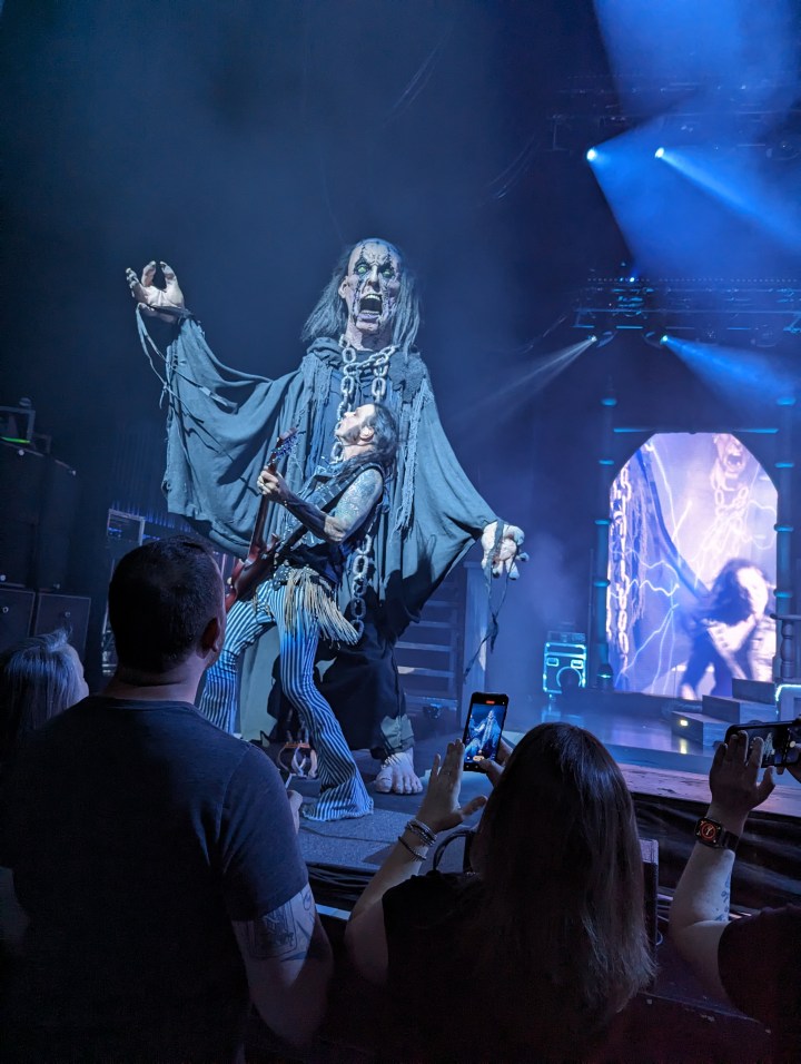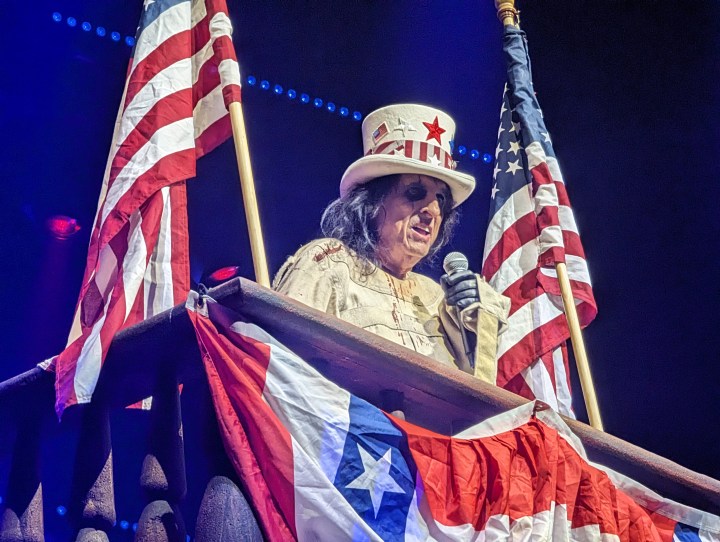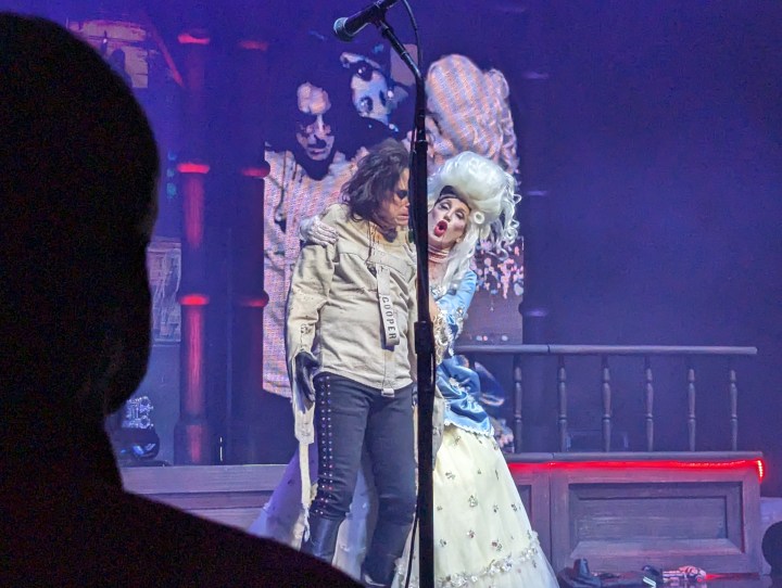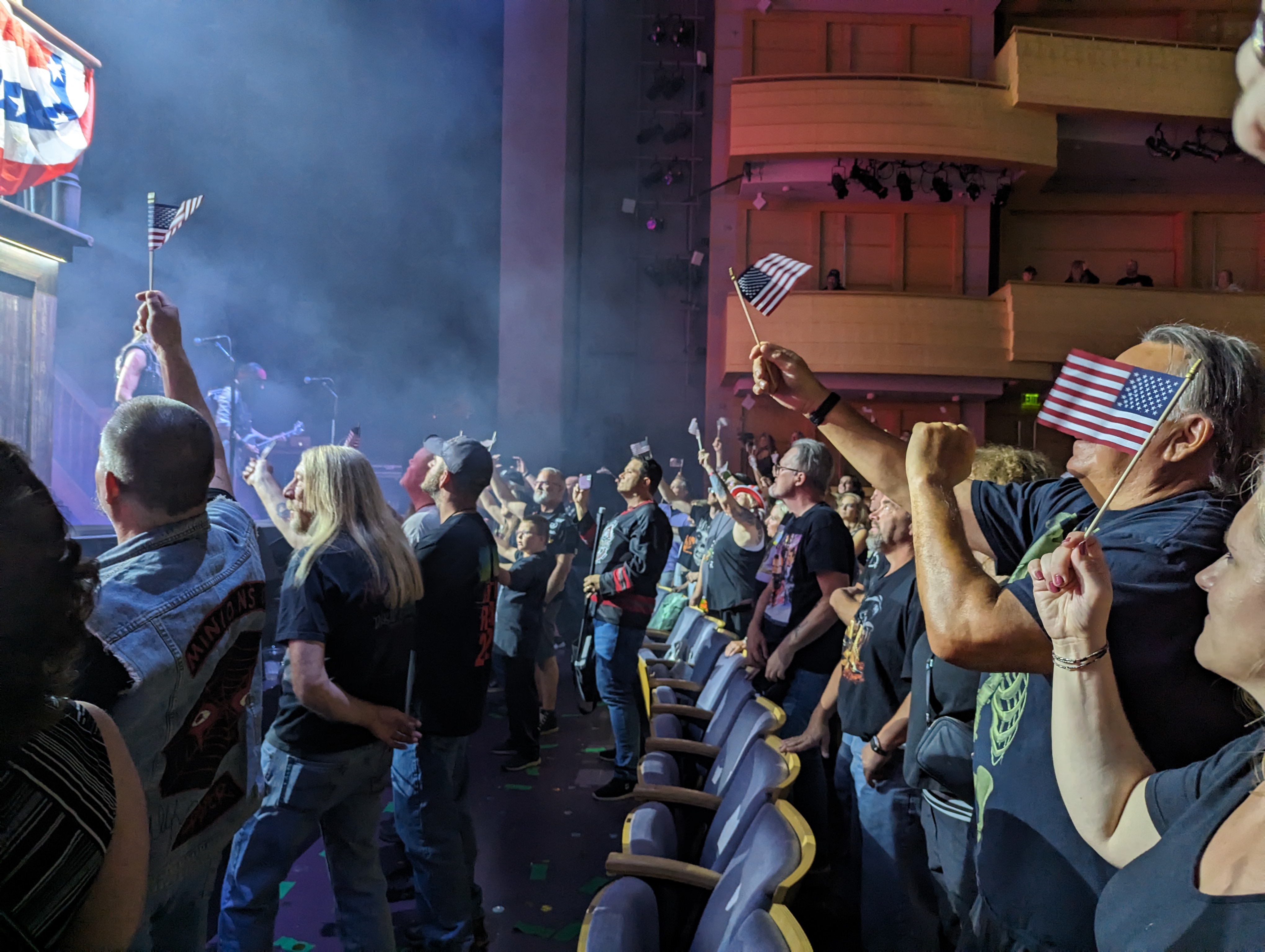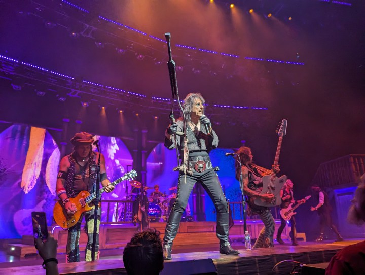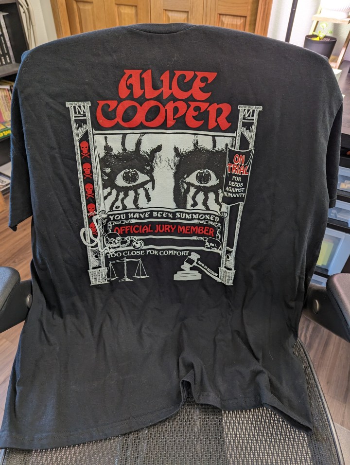 As there are at all shows, there were folks in all sorts of garb, someone was in a suit in front of us, and lots of Alice tour wear was on display. There was someone with a plastic doll and one woman was passing out little flags to wave during “Elected”. Like Alice Cooper fan old home week.