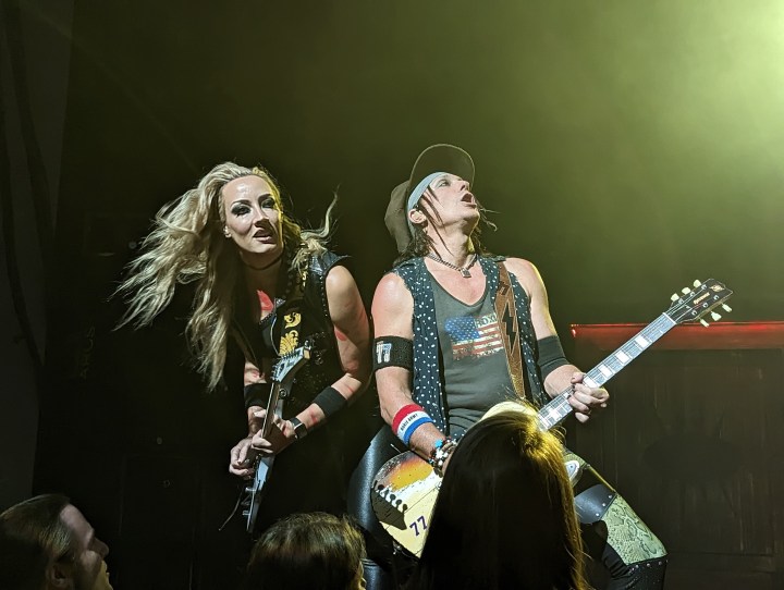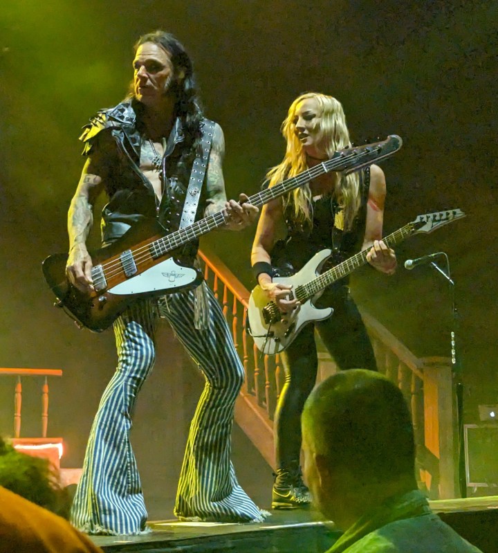 Nina Strauss was all over the place, and she did a lot of photo ops for eager cameras. Her hair flipping was a spectacle in itself. Ryan had a little game where he tossed his pick into the air and caught it and slid into the next cord.